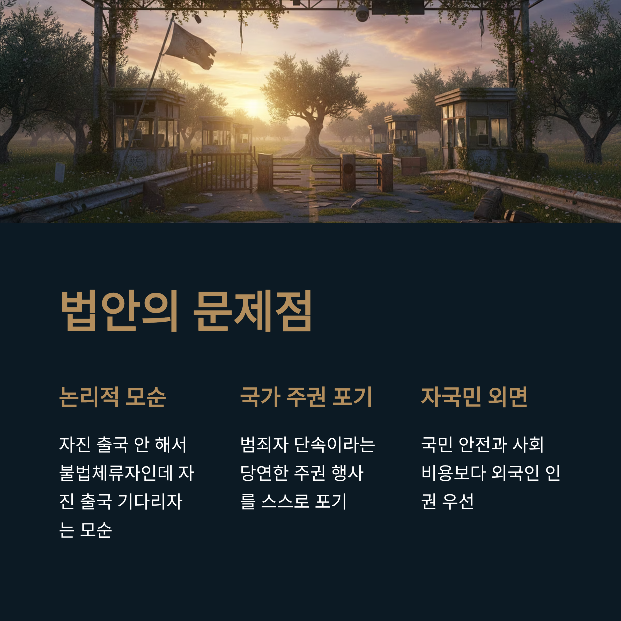 결국 이 법안은 자국민의 안전과 사회적 비용은 외면한 채, 국가의 출입국 관리 질서를 무너뜨리는 결과를 초래할 수 있습니다.