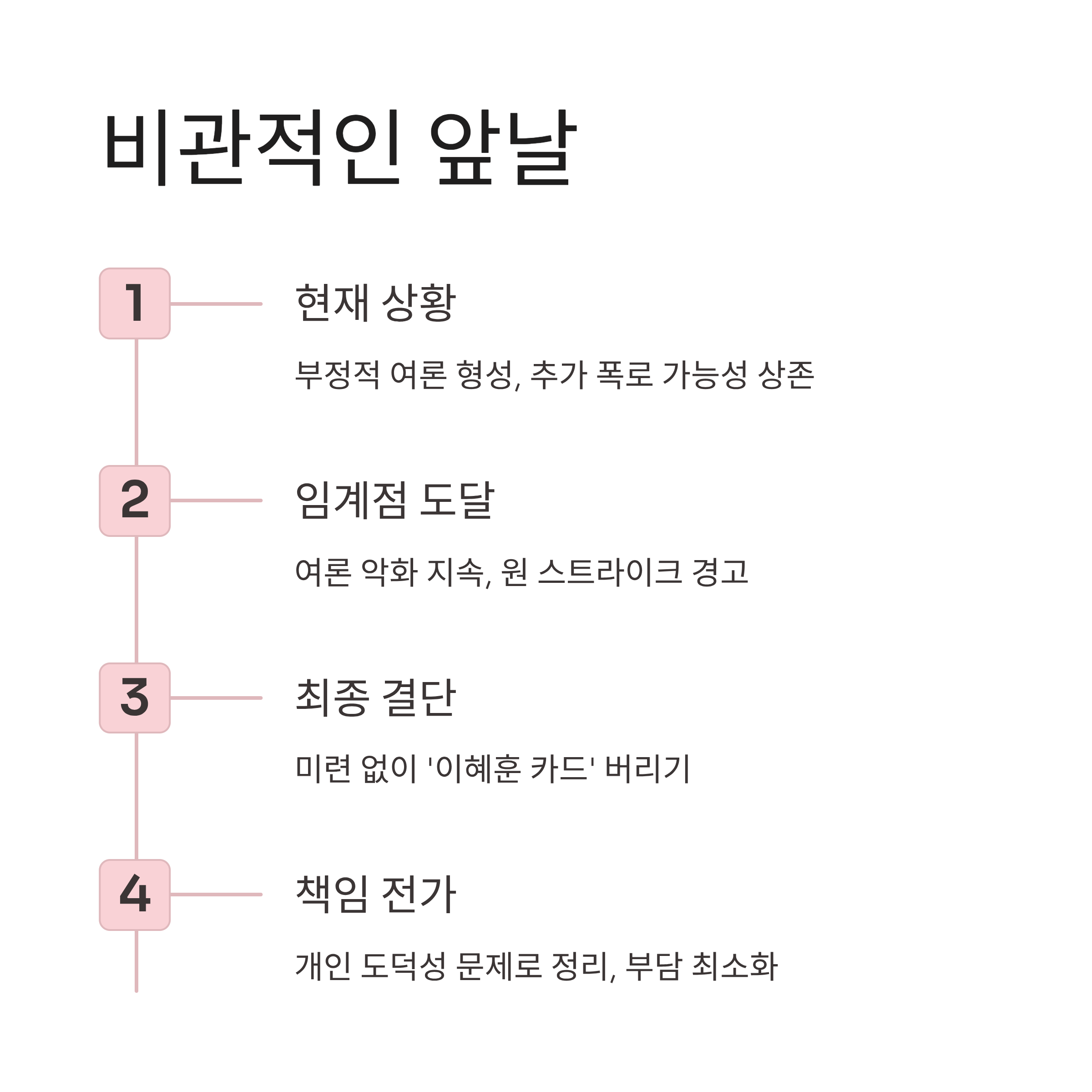 현재까지의 상황을 종합해 볼 때, 이혜훈 후보자의 앞날은 매우 비관적입니다. 추가 폭로 가능성이 상존하고, 이미 형성된 부정적 여론을 되돌리기란 사실상 불가능에 가깝습니다. 결국 이재명 대통령은 '원 스트라이크' 경고 이후 추가적인 타격이 들어오고 여론이 임계점을 넘는 순간, 미련 없이 '이혜훈 카드'를 버릴 가능성이 높습니다. 그는 지명을 철회하면서 "국민의 눈높이에 맞지 않는 인사는 과감히 정리한다"는 명분을 취하고, 인사 검증 실패의 책임을 후보자 개인의 도덕성 문제로 전가하며 정치적 부담을 최소화할 것입니다.