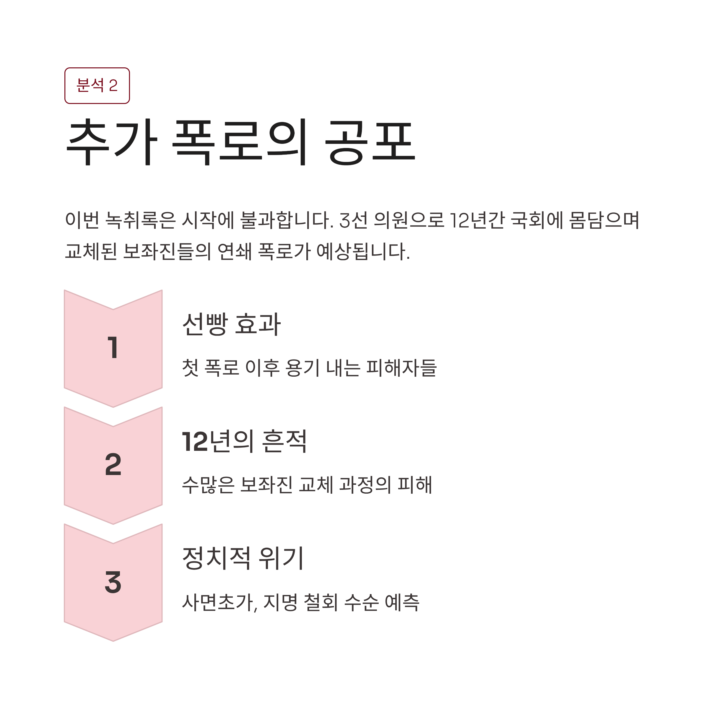 2. 추가 폭로 가능성 농후: 이번 폭로가 '선빵'에 불과하며, 3선 의원을 지내는 12년 동안 수많은 보좌진이 교체되었을 것이므로 비슷한 피해를 주장하는 추가 폭로가 이어질 가능성이 매우 높다는 관측이 지배적입니다.
