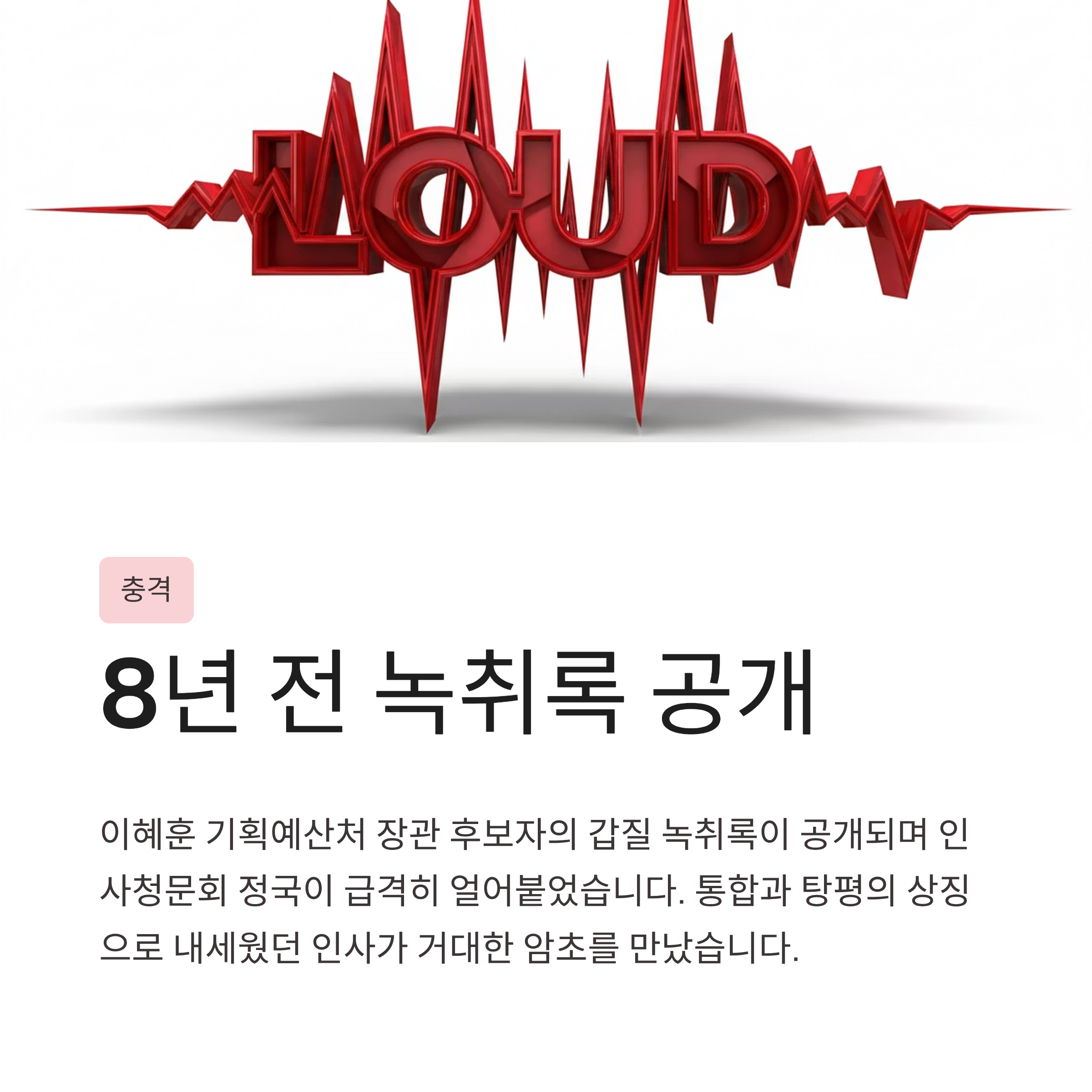 이재명 대통령이 단행한 파격적인 인사로 평가받던 이혜훈 기획예산처 장관 후보자의 지명이 거대한 암초를 만났습니다. 통합과 탕평의 상징으로 내세웠던 이 후보자를 둘러싸고 과거의 갑질 의혹이 담긴 충격적인 녹취록이 공개되며 인사청문회 정국이 급격하게 얼어붙고 있습니다. 8년 전 보좌진에게 가한 인격 모독과 폭언이 담긴 음성 파일이 공개되면서, 이 후보자의 도덕성 논란은 걷잡을 수 없이 커지는 모양새입니다. 이번 파문은 단순히 한 개인의 과거 문제를 넘어, 그를 지명한 이재명 대통령의 정치적 의도와 향후 정국 운영에 어떤 영향을 미칠지에 대한 관심으로까지 번지고 있습니다. 본 글에서는 공개된 녹취록의 구체적인 내용과 그 파장을 분석하고, 앞으로 이어질 추가 폭로의 가능성을 진단합니다. 또한, 이번 사태를 통해 이재명 대통령이 얻고자 했던 정치적 이득과 손실을 계산하며, 그의 향후 선택지를 예측해보고자 합니다.