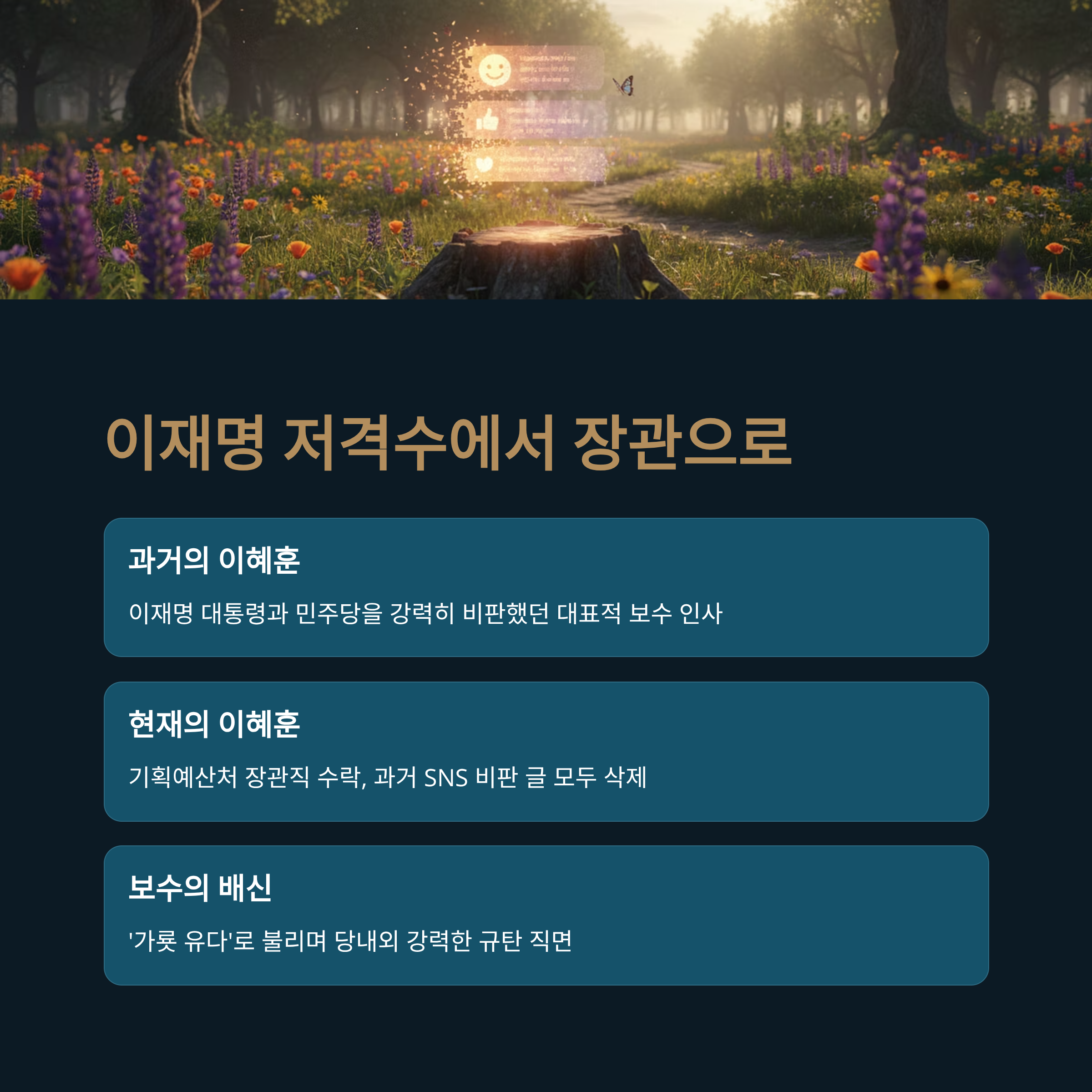 이혜훈의 변신과 SNS 삭제: 이재명 저격수였던 이혜훈 전 의원이 기획예산처 장관직을 수락하며 과거 비판 글을 모두 삭제해 '기획된 배신'이라는 비판을 받고 있습니다.