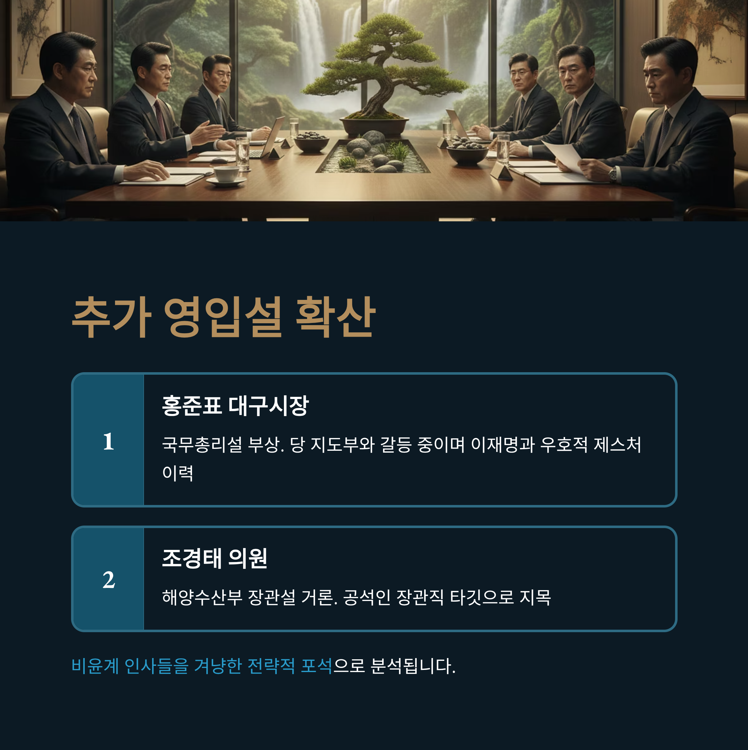 추가 영입설 확산: 홍준표(국무총리설), 조경태(해양수산부 장관설) 등 중진급 인사들의 이름이 거론되며 당내 불신이 깊어지고 있습니다.