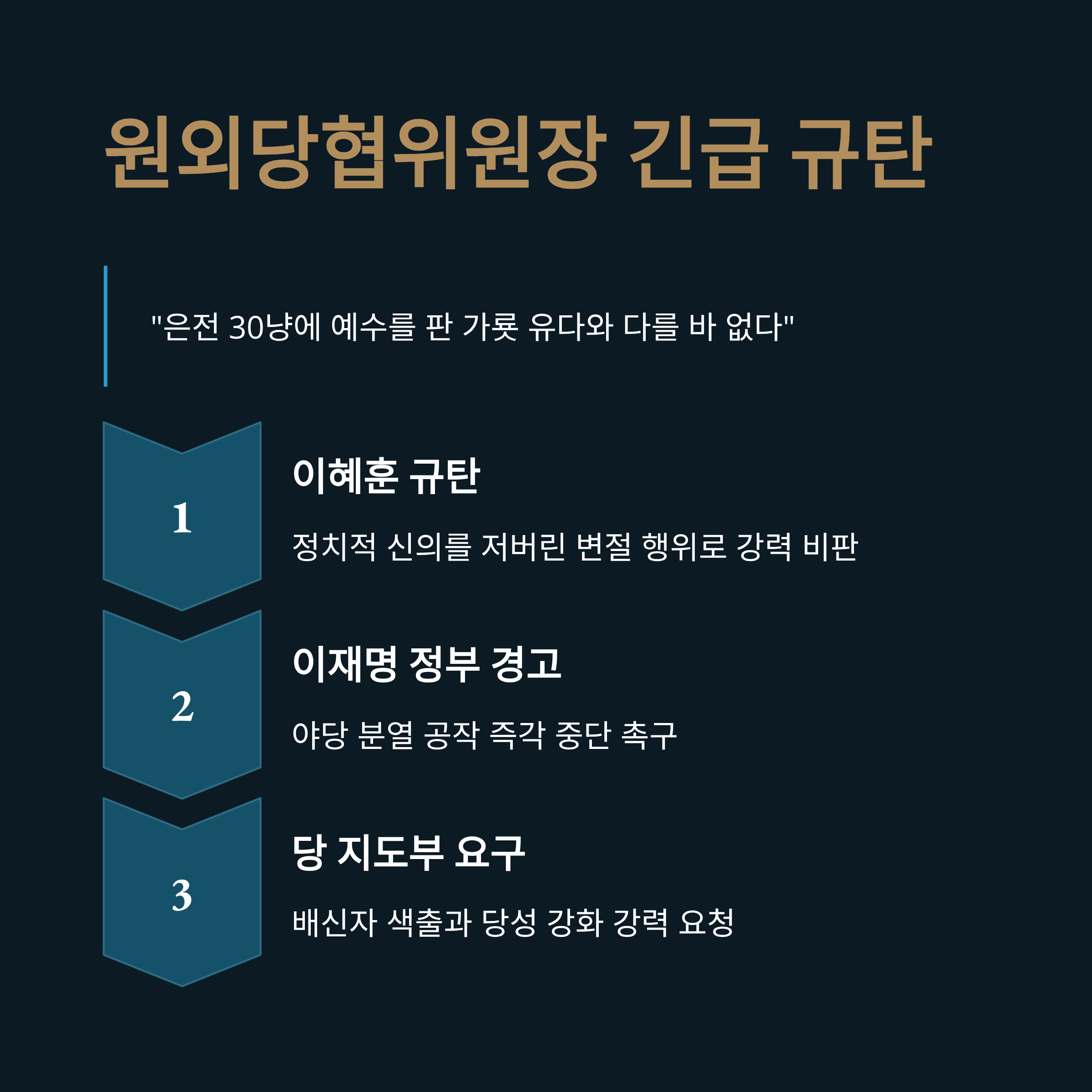 원외당협위원장 긴급 규탄 성명: 이혜훈의 행보를 '은전 30냥에 예수를 판 가룟 유다'에 비유하며 강력히 규탄했으며, 이재명 정부의 행태를 '야당 분열 공작'으로 규정하고 즉각 중단을 촉구했습니다.