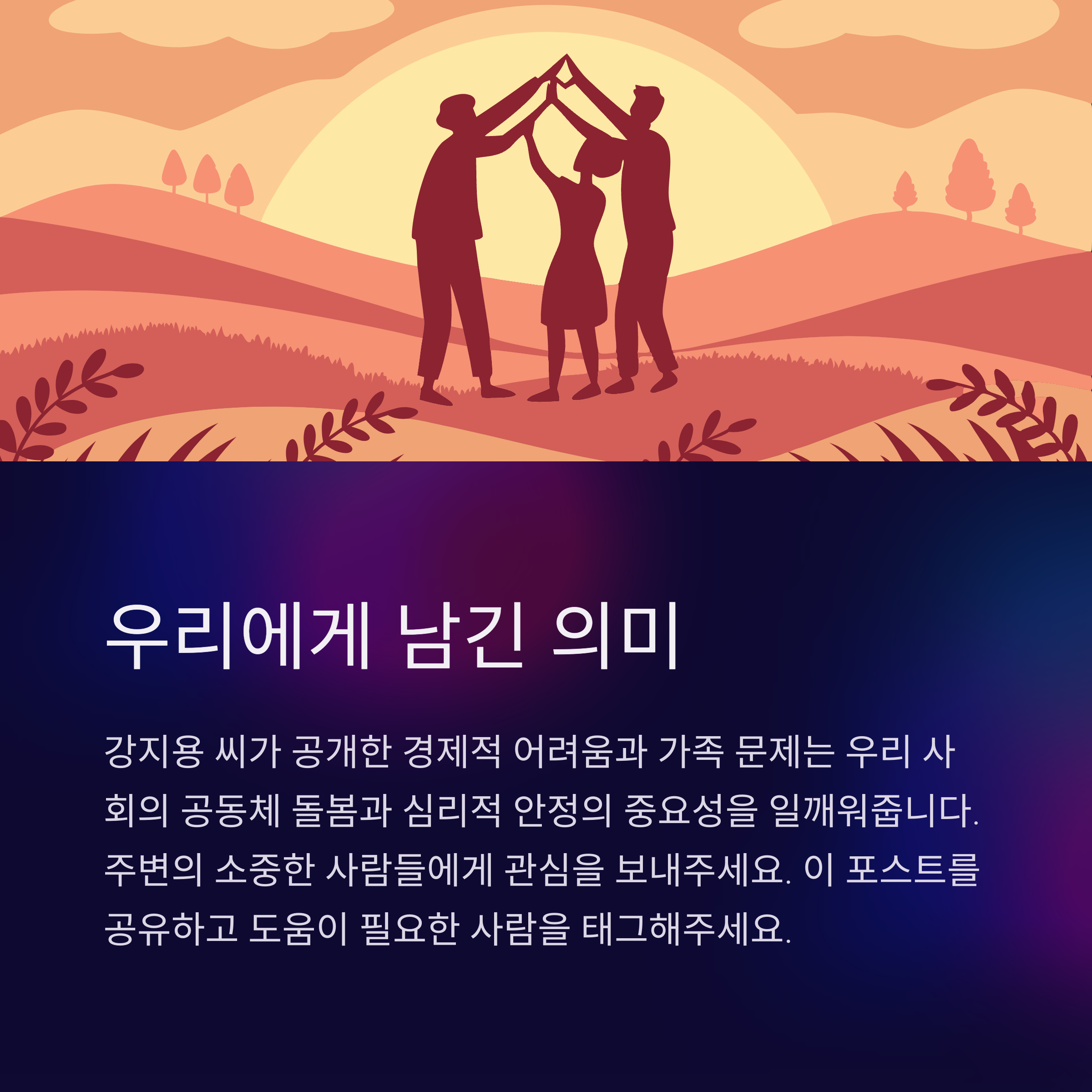 강지용의 사망 이후, 대중들은 그의 삶과 방송 출연 당시의 메시지를 다시금 떠올리고 있습니다. 이는 아마도 개인적 이야기뿐 아니라 더 큰 차원에서의 사회적 안전망 구축 필요성을 제기하는 계기가 되고 있습니다. 특정 개인의 이야기로 그치는 것이 아니라, 사회적 구조의 빈틈을 돌아보고 개선하기 위한 논의의 필요성을 강조하는 목소리가 커질 것으로 예상됩니다.