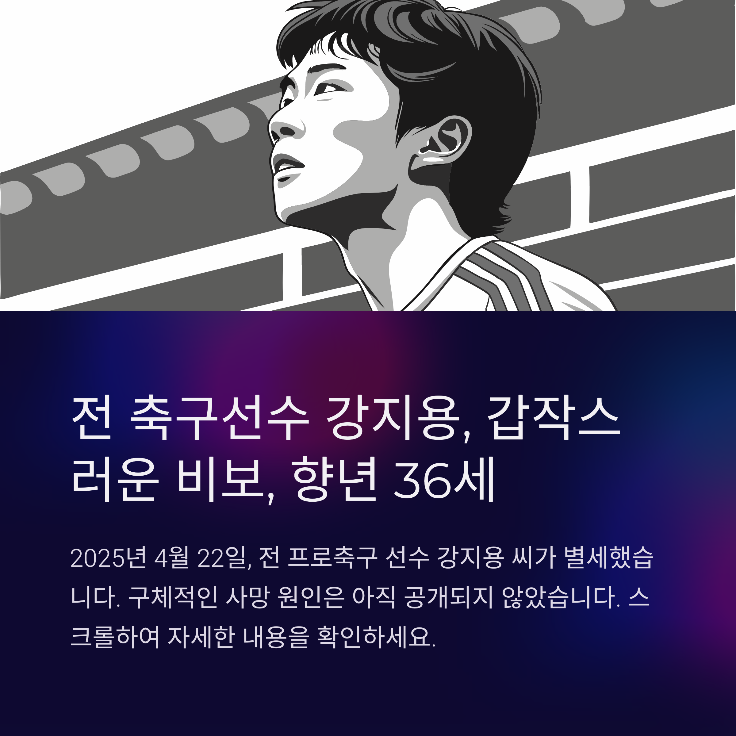 1. 강지용 씨는 2025년 4월 22일 사망하였으며, 충격적인 소식이 전해진 후 사망 원인에 대한 자세한 정보가 아직 나오지 않고 있습니다.