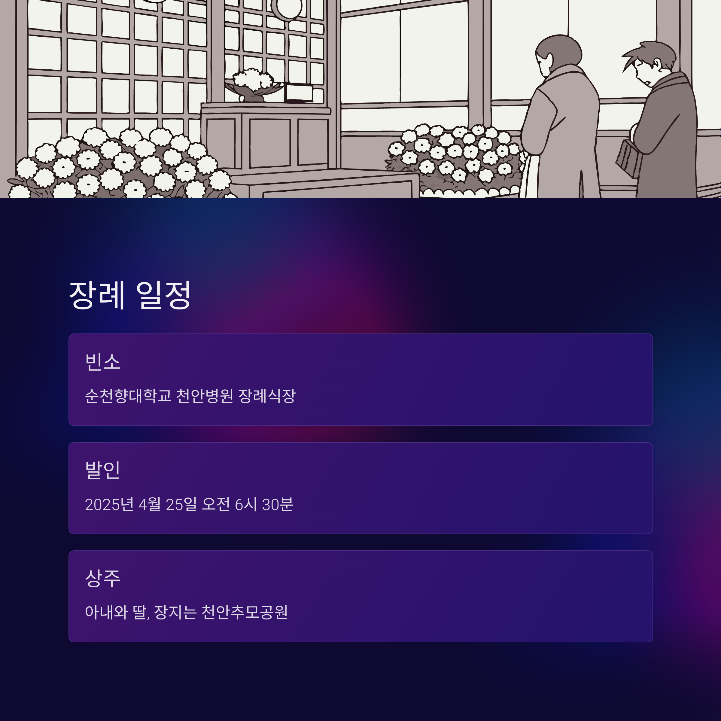 4. 그의 빈소는 충남 천안 동남구의 순천향대학교 천안병원 장례식장에서 마련되었고, 발인은 2025년 4월 25일 오전 6시 30분입니다.