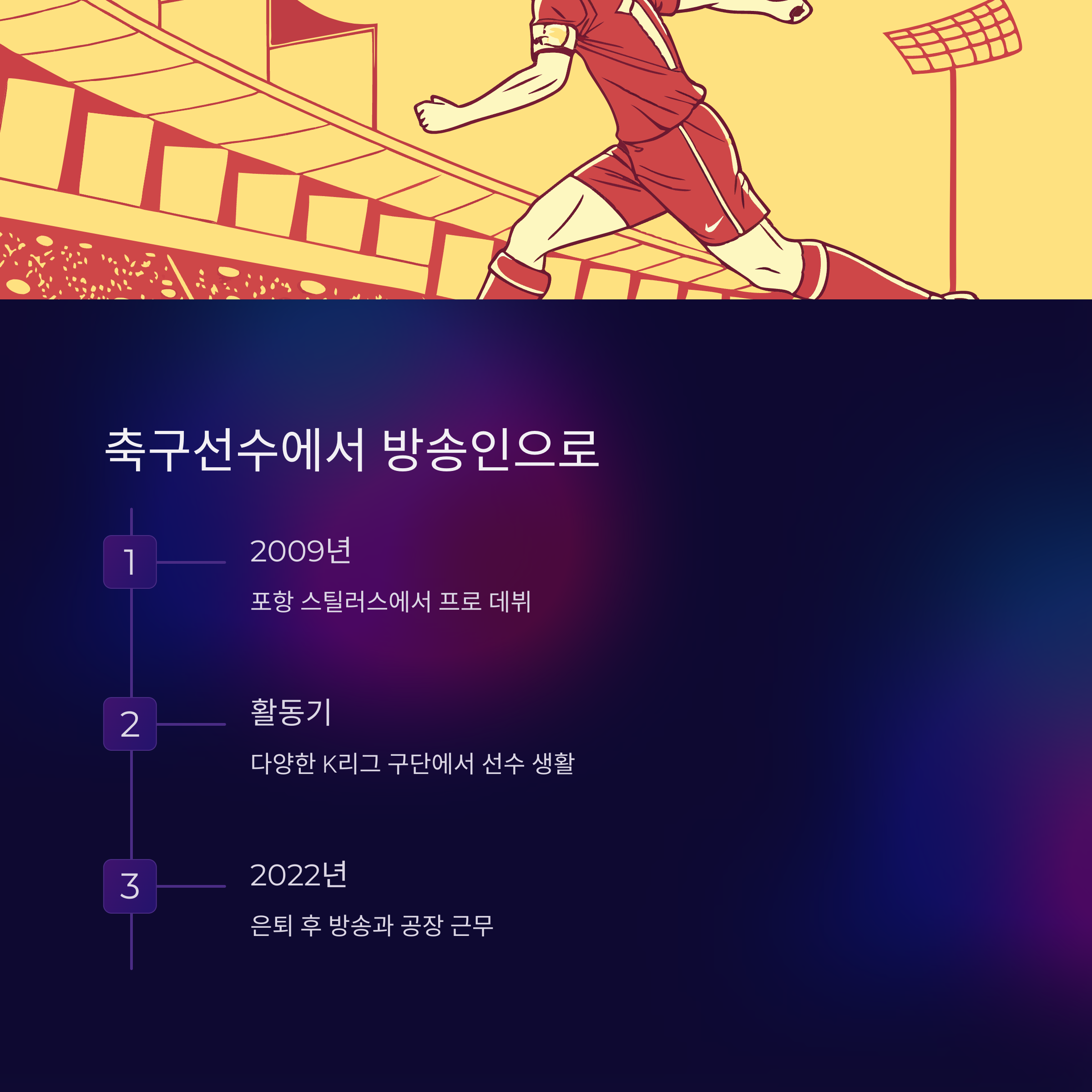 2. 그는 2009년 포항 스틸러스에서 프로 축구 선수로 데뷔한 뒤, 2022년에 은퇴하며 방송을 통해 새롭게 주목받던 인물이었습니다.