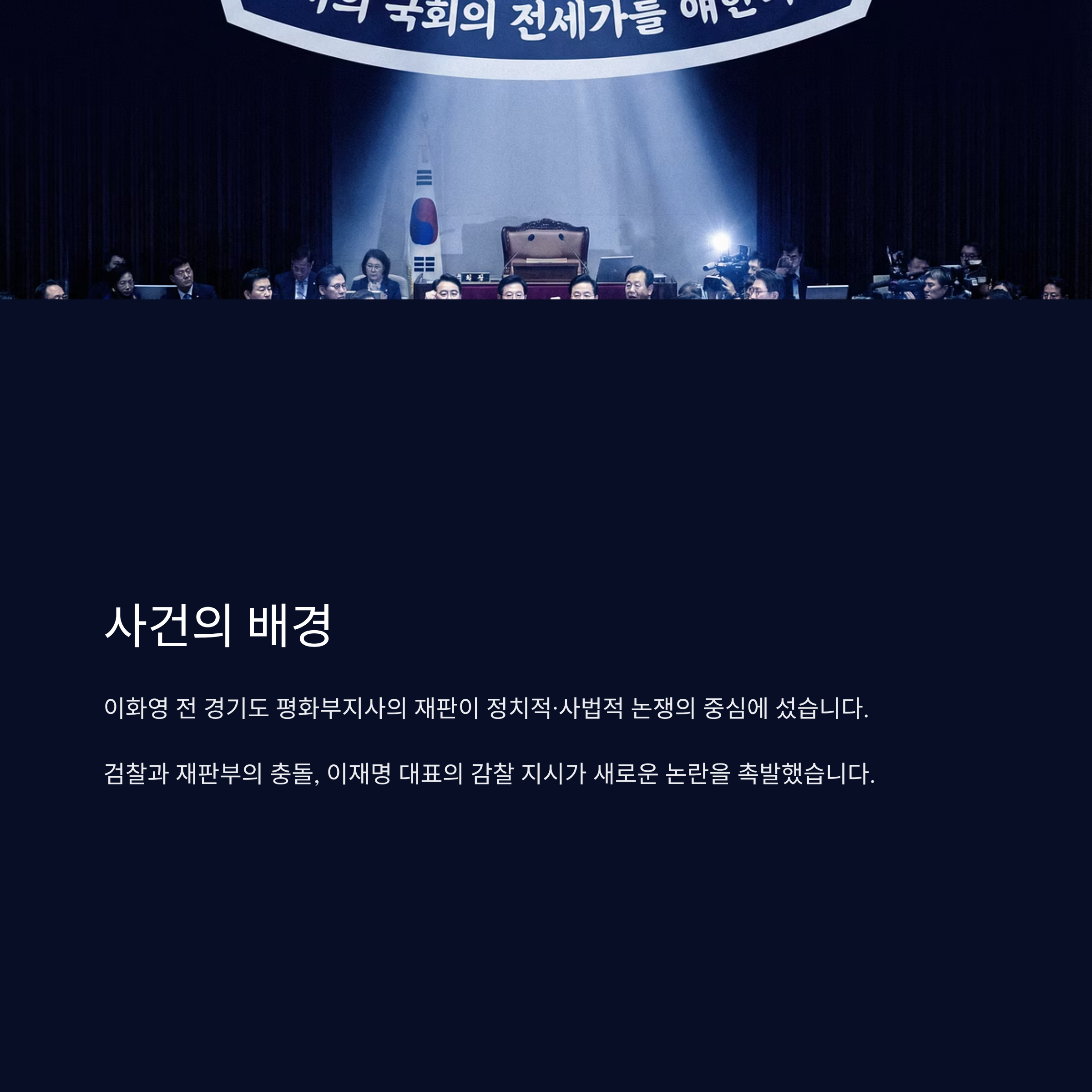 이화영 전 경기도 평화부지사의 재판은 단순히 법적 분쟁이 아닌 정치적, 사법적 논쟁의 한가운데 있습니다. 주요 사건은 연어 술파티 회유 의혹, 검사들의 법정 퇴정, 검찰과 재판부 간 충돌을 포함합니다. 특히 이재명 더불어민주당 대표의 감찰 지시는 정치적 여파를 더욱 증폭시키며 새로운 논란을 일으켰습니다. 이번 재판은 사법 체계의 공정성과 중립성을 놓고 큰 논쟁을 불러일으키고 있으며, 재판부의 증인 기각이나 검찰 측 행동의 법적 적절성에 대중적 관심이 집중되고 있습니다. 본 포스팅에서는 해당 사건을 심층적으로 분석하고 나아가 한국 사법 제도의 미래 방향을 모색해 보겠습니다.