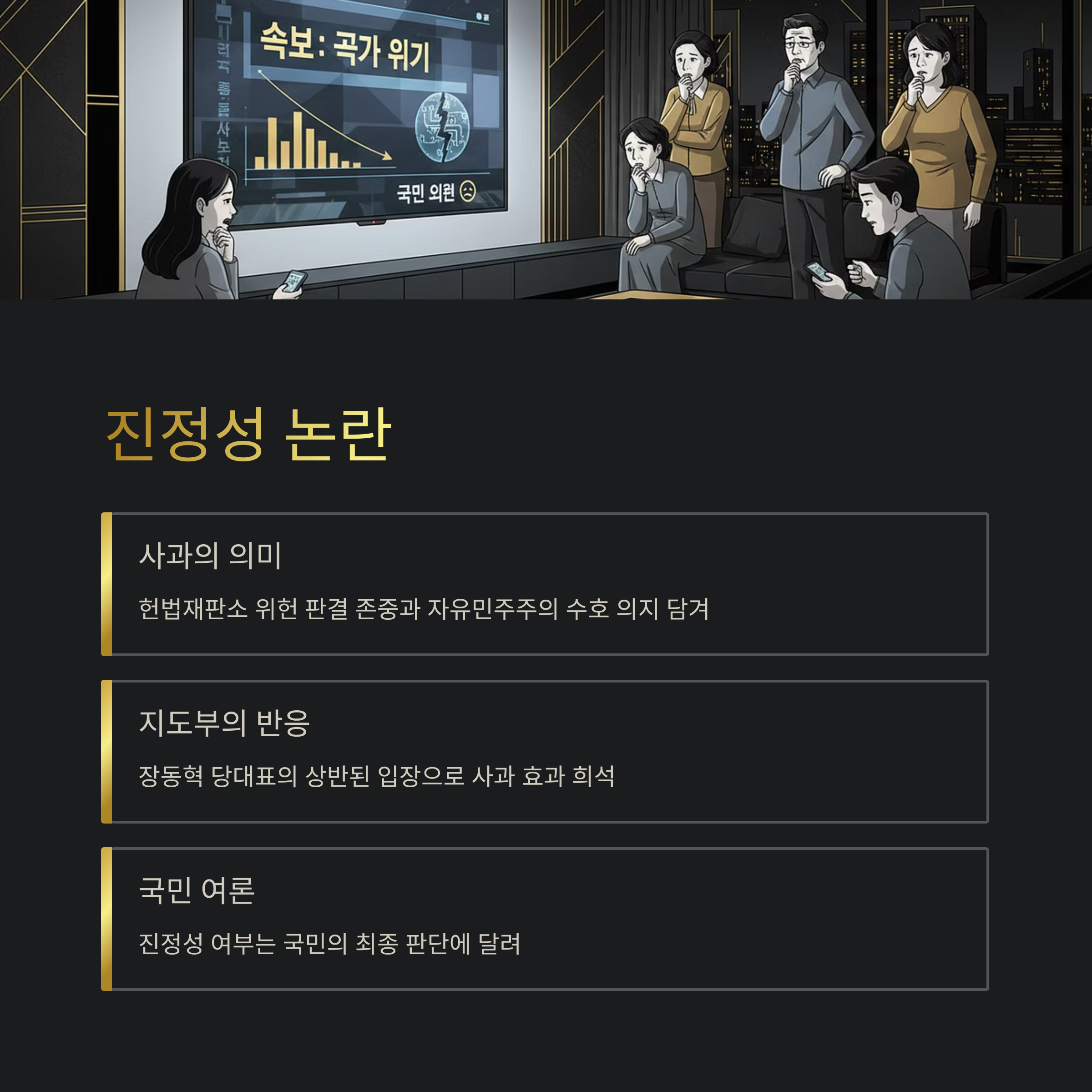 초선·재선 의원들의 사과는 본질적으로 국민 신뢰 회복을 목표로 했지만, 당 지도부와의 입장 차이가 이를 희석시켰습니다. 사과 문구에는 헌법재판소의 위헌 판결에 대한 존중과 자유민주주의 수호 의지가 담겨 있었습니다. 하지만 여전히 장동혁 당대표가 계엄을 의회 폭거에 대한 대응으로 설명하면서, 당의 공식 입장이 국민과의 괴리를 벌리는 양상입니다. 사과 여부와 진정성은 국민 여론에 의해 최종 판단될 것입니다. 책임지고 사퇴하는것이 사과의 진정성이라 할 수 있습니다.