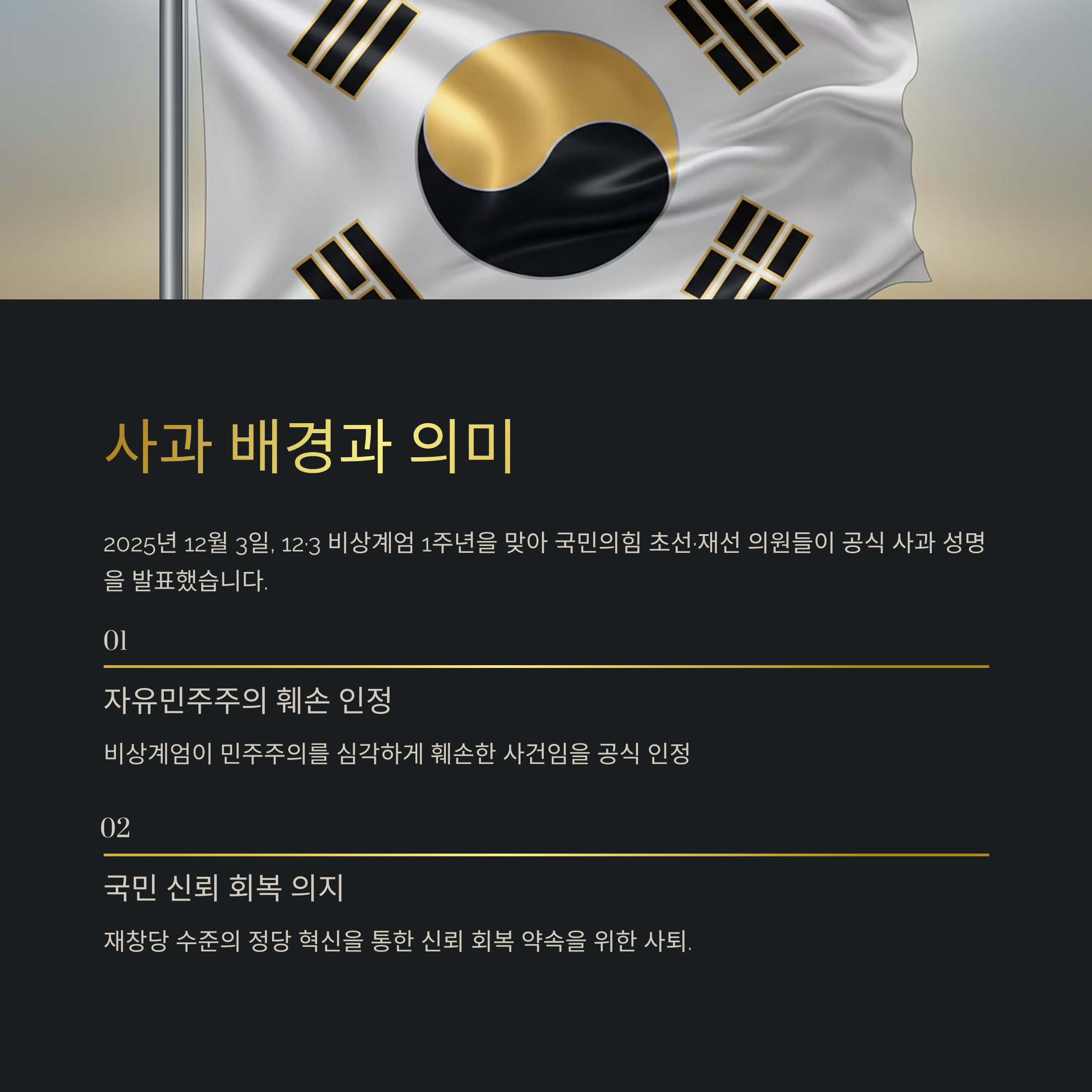 2025년 12월 3일, 국민의힘은 12·3 비상계엄 1주년을 맞아 공식 사과 성명을 발표했습니다. 이 사건은 윤석열 전 대통령 재임 당시 발생한 것으로, 많은 논란과 정치적 갈등을 불러일으켰습니다. 이후 헌법재판소가 이를 위헌으로 판결한 사건으로 인해 국민의힘은 정치적 비판에 직면하게 되었습니다. 이번 사과는 당의 내부 갈등이 외부로 드러나는 계기가 되었으며, 특히 초선·재선 의원들의 독자적인 입장 표명은 당내 세대 차이를 드러내는 진원지로 작용하고 있습니다. 본 글에서는 국민의힘 사과 성명의 주요 내용을 분석하고, 당내 갈등의 본질과 장기적인 정치적 신뢰 회복 방안을 모색하고자 합니다.