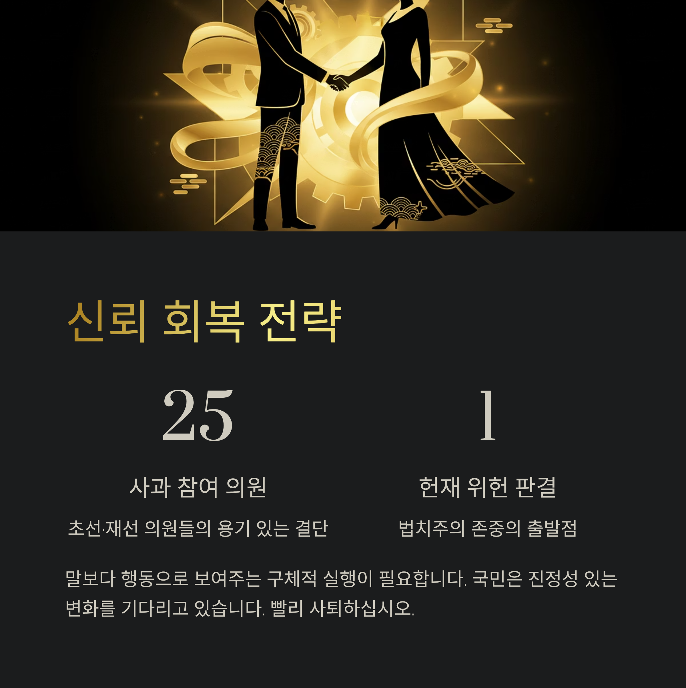 이번 사안은 단순히 여야 관계를 넘어 대한민국의 민주주의와 법치주의 발전에 중요한 이정표로 자리 잡을 수 있습니다. 윤석열 전 대통령과의 정치적 단절 선언, 헌법재판소 결정의 존중 표명 등은 단순한 정치적 수사가 아닌 진정성의 신호로 국민에게 어떻게 다가갔는지 살펴보는 기회가 될 것입니다. 또한 당내 갈등이 공개적으로 표출된 상황에서 국민의힘이 제도 개선과 혁신을 통해 어떻게 위기를 기회로 삼을 수 있을지 논의하고자 합니다.