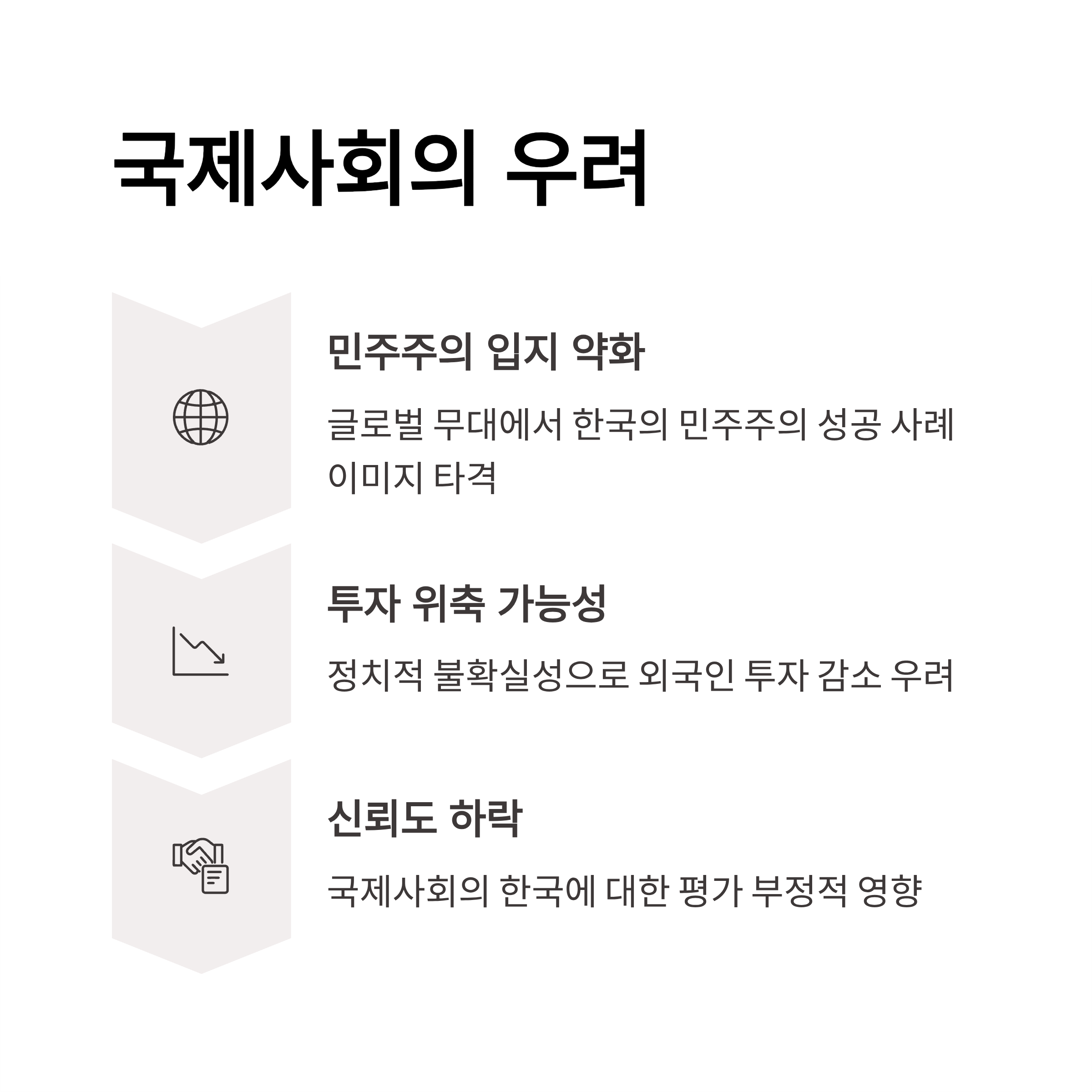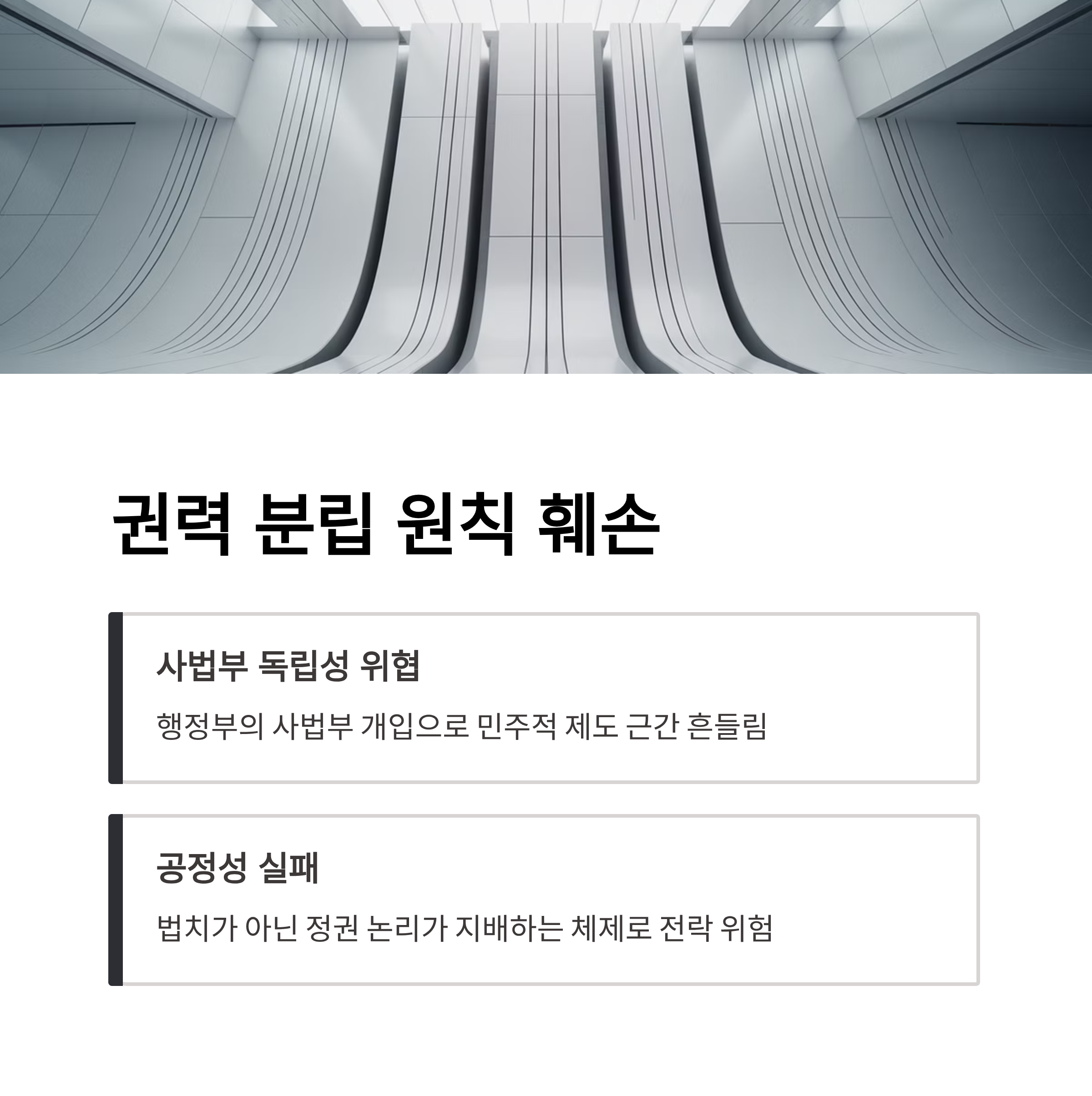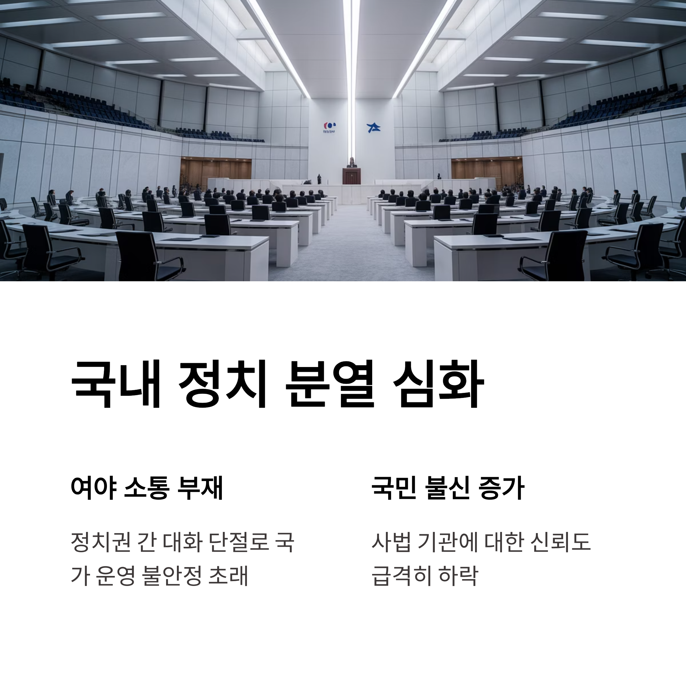| A. 국민들은 민주적 제도와 사법 마지막 방어선으로서의 신뢰성을 잃을 우려가 있습니다. 이는 내수 경제 및 사회적 안정에도 부정적인 파급 효과를 초래할 수 있습니다. |