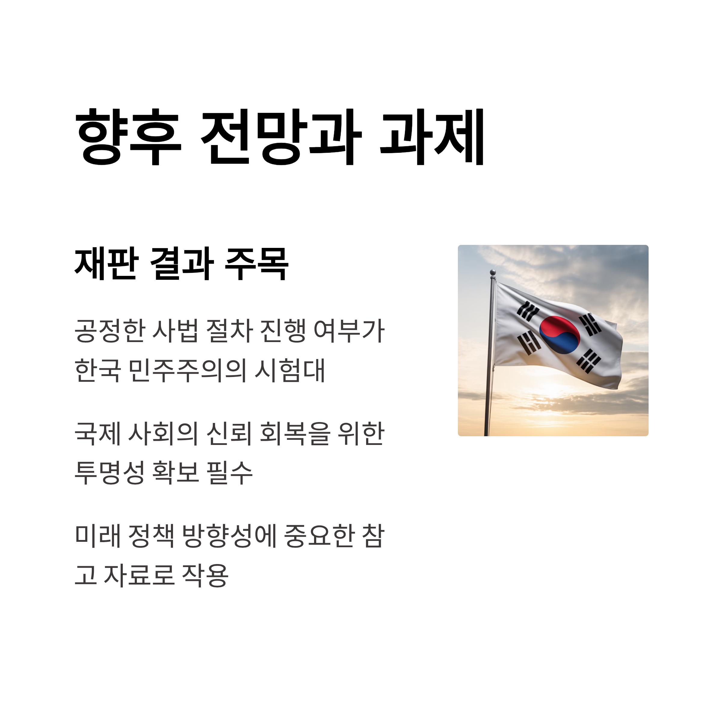 5. 논쟁은 대한민국의 민주주의와 사법체계의 신뢰성에 중대한 영향을 미칠 가능성이 큽니다.