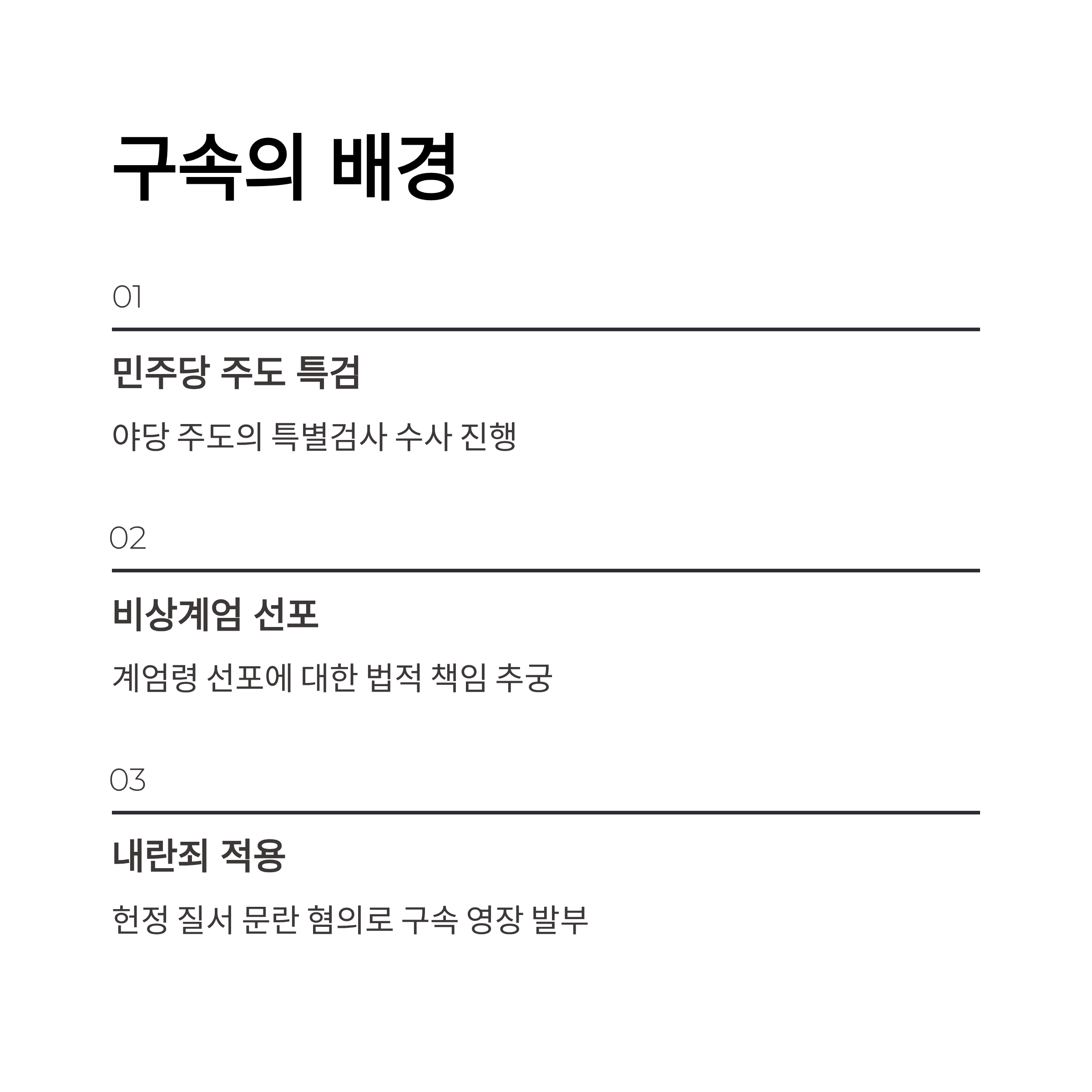 2. 민주당 주도의 특검과 비상개엄, 내란죄 등 여러 사유가 구속 배경으로 제시됩니다.