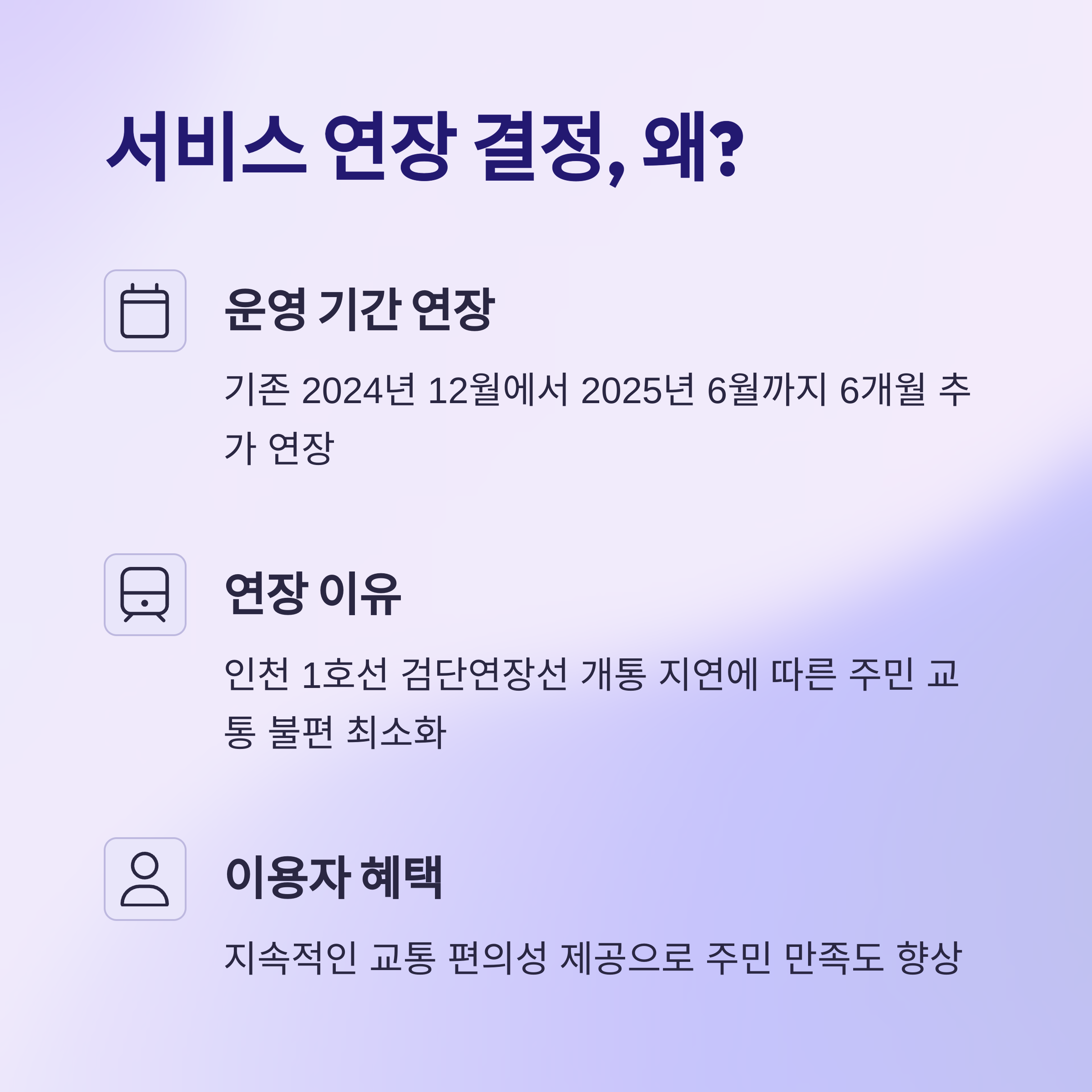 이번 서비스 연장 결정은 현대자동차, 선진버스, 인천도시공사(iH) 등 주요 파트너 간의 협약을 통해 이루어졌으며, 검단신도시의 급속한 발전과 시민의 요구를 반영한 결과물입니다.
