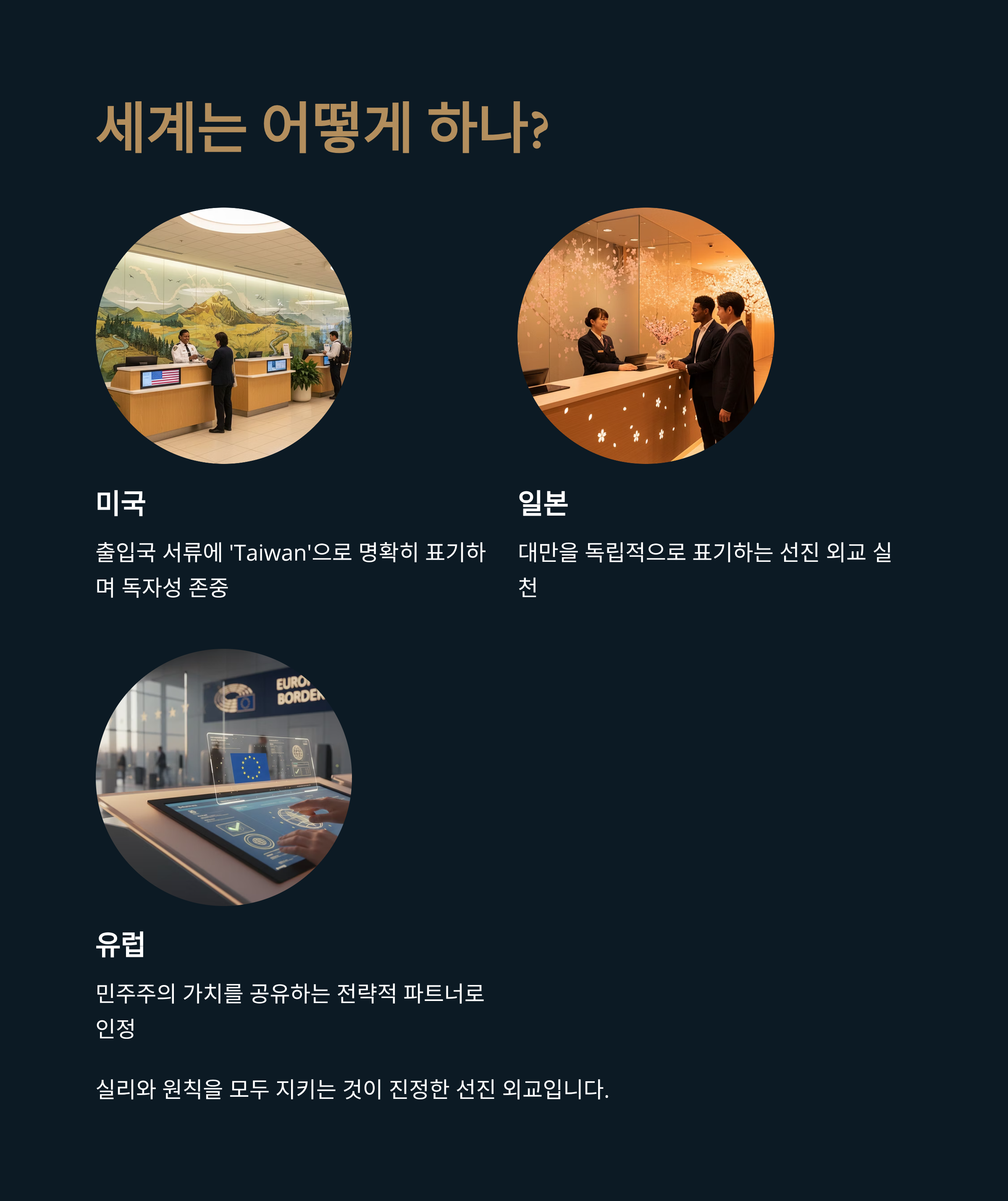 현재 미국, 유럽, 일본 등 주요 선진국들은 출입국 관련 서류에 대만을 '대만(Taiwan)'으로 명확하게 표기하며, 그들의 독자성을 존중하고 있습니다.