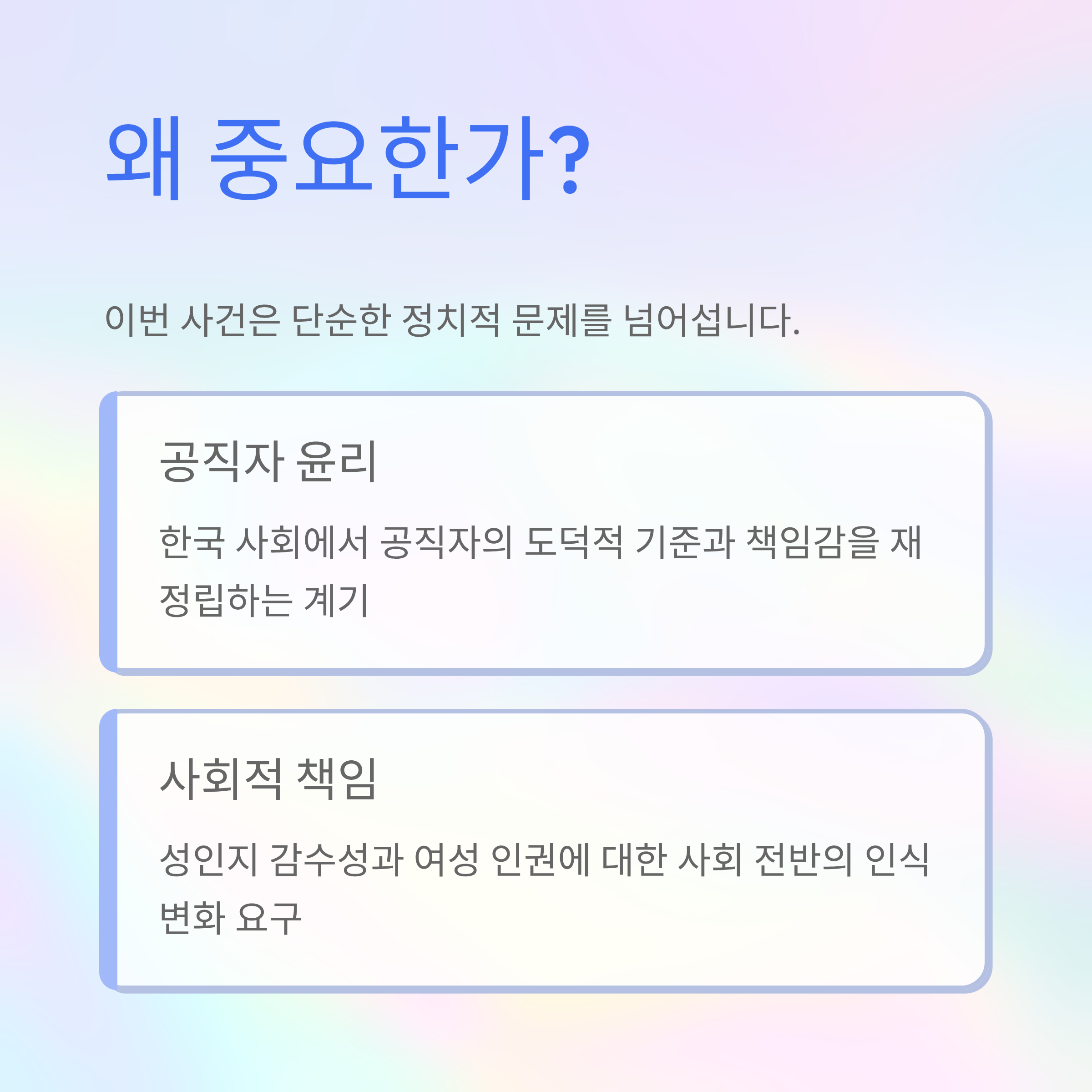 한국 정치권과 사회는 이번 사례를 통해 공직자의 책임감을 재정립해야 할 중요한 기로에 서 있습니다.