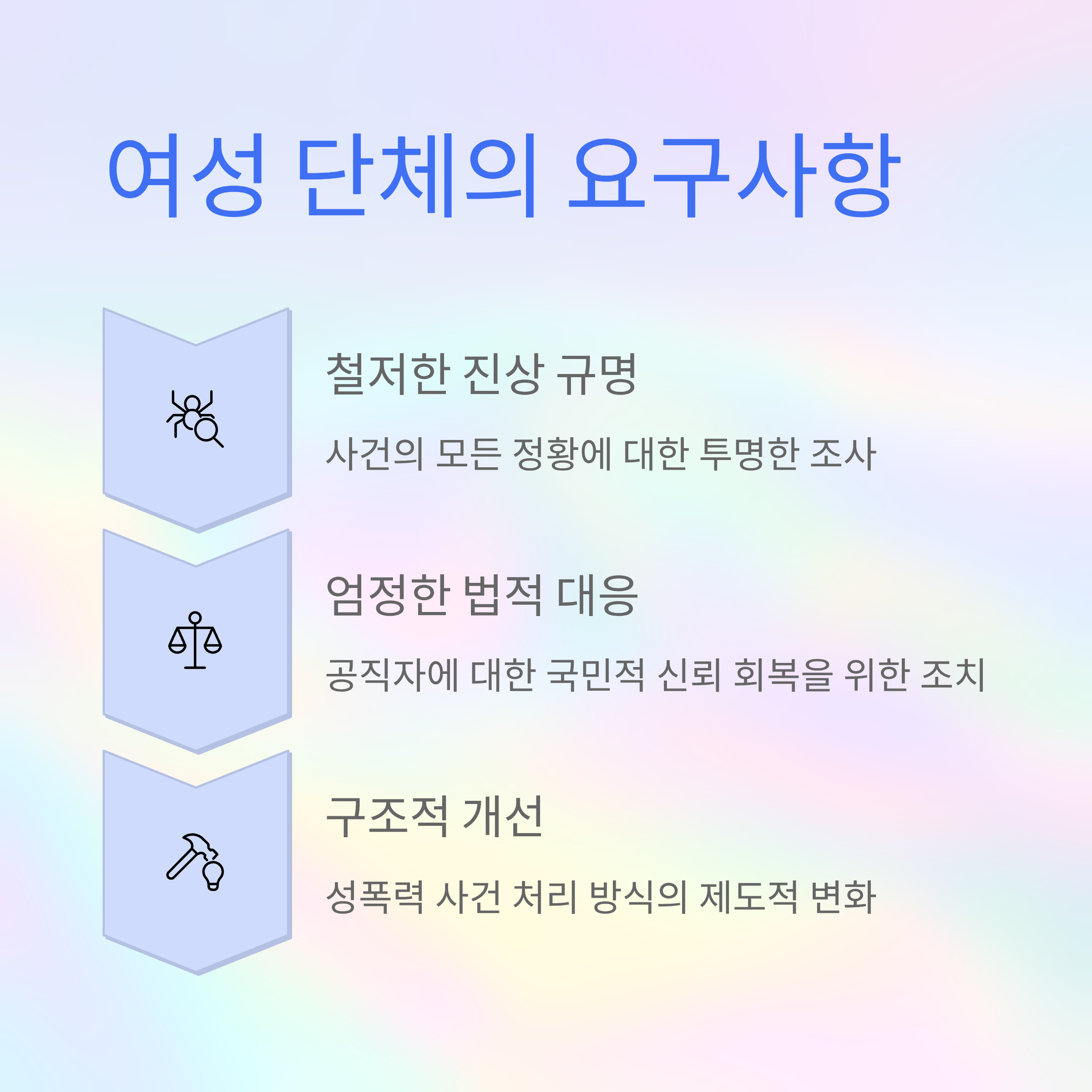 특히 공직자에 대한 국민적 신뢰 회복을 위한 엄정한 대응을 요구하는 목소리가 커지고 있다는 점도 주목할 대목입니다. 단체들은 사건을 단순히 개인 간의 문제가 아닌 사회적, 구조적 문제로 바라보고 있으며, 이는 향후 성폭력 관련 사건 처리 방식에도 상당한 영향을 미칠 것으로 보입니다.