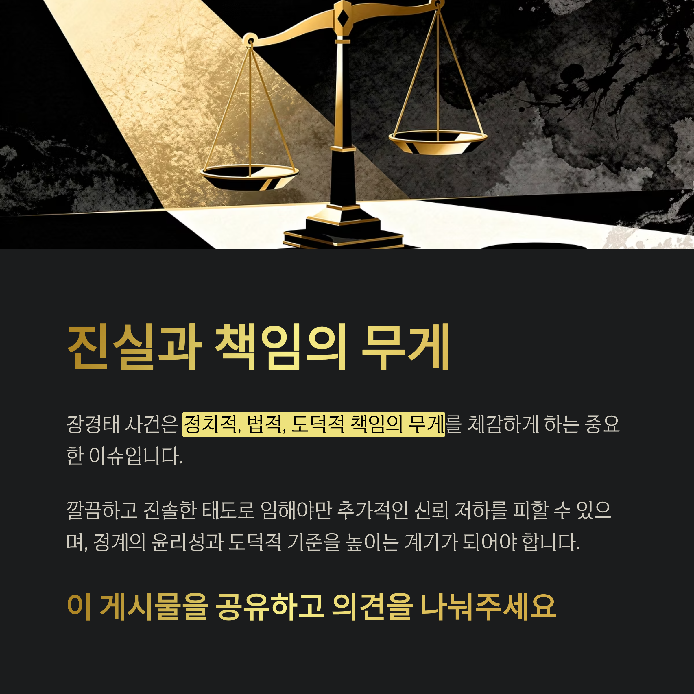 장경태 사건은 단순히 의혹제기에서 그치지 않고, 정치적, 법적, 도덕적 책임의 무게를 체감하게 하는 중요한 이슈다. 무엇보다도 이번 사건을 통해 정치적 인물이 어떻게 이런 위기를 대응하고, 끝내 신뢰를 회복할 수 있을지에 대한 귀감이 되어야 한다. 장경태의 대응은 다소 혼란스러운 상황에도 불구하고 깔끔하고 진솔한 태도로 임해야만 추가적인 신뢰 저하를 피할 수 있을 것이다. 또한 이번 사안을 통해 정치적 윤리가 얼마나 중요한지 정계 전체에 경고 효과를 줄 것으로 보인다. 앞으로 이어질 법적 공방과 책임 여부는 국민의 알 권리를 충족시키는 동시에 정계의 윤리성과 도덕적 기준을 높이는 계기가 되어야 한다.