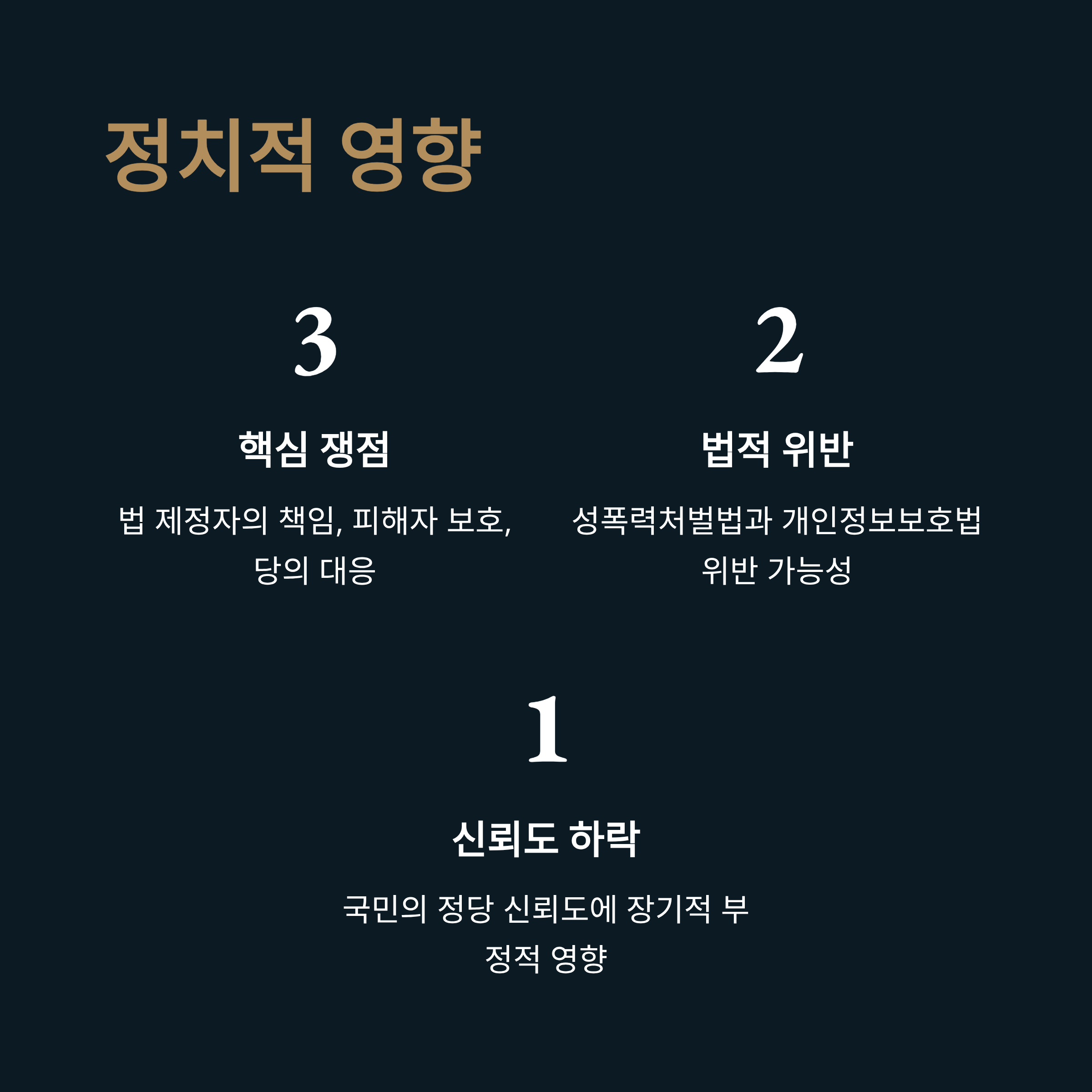 피해자 신원 공개 행위는 국민의 눈높이에 맞춘 정치적 윤리와 거리가 멀다는 지적을 받고 있습니다. 해당 사건은 더불어민주당이 내부적으로 이를 해결하지 못한다면, 국민의 정당에 대한 신뢰를 더욱 약화시킬 위험이 큽니다. 장경태 의원 개인의 문제로만 국한되지 않고, 당의 전반적인 성범죄 대응 정책과 대응 방식에도 부정적인 파장이 예상됩니다. 최근 비슷한 정치적 논란에서 국민의 선호도가 감소한 사례들을 통해, 정책 일관성과 책임감 있는 대응이 장기적으로 중요한 성공 요인임을 보여줍니다.