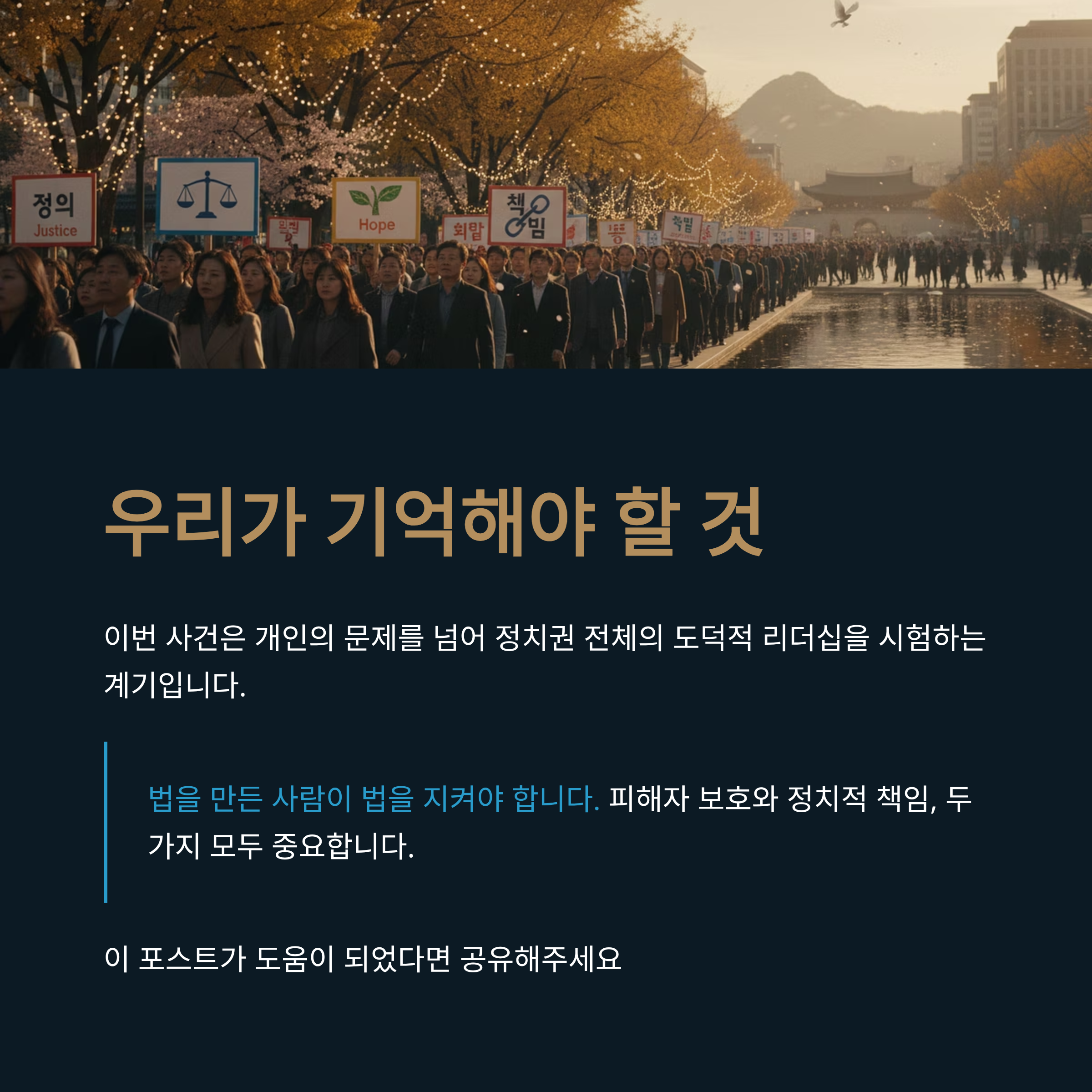 장경태 의원이 직면한 성추행 논란은 단순히 개인의 문제가 아니라 시스템적, 정치적 도덕성 문제를 동시에 제기하고 있습니다. 이번 사건은 피해자 보호를 위한 법 제정의 중요성을 환기시키는 동시에, 이를 위반한 행태에 대한 법적 및 정치적 책임 규명을 요구하고 있습니다. 성범죄 문제는 단순히 사법적 처리가 아니라 정치권 전반의 도덕적 리더십을 시험하는 문제로, 해당 사건은 국민들의 정치 신뢰도에 장기적인 영향을 미칠 가능성이 큽니다. 장 의원뿐만 아니라 더불어민주당 전체가 이번 사건을 계기로 보다 단호한 정책 실행과 대응 방안을 마련해야 할 필요성이 있습니다.