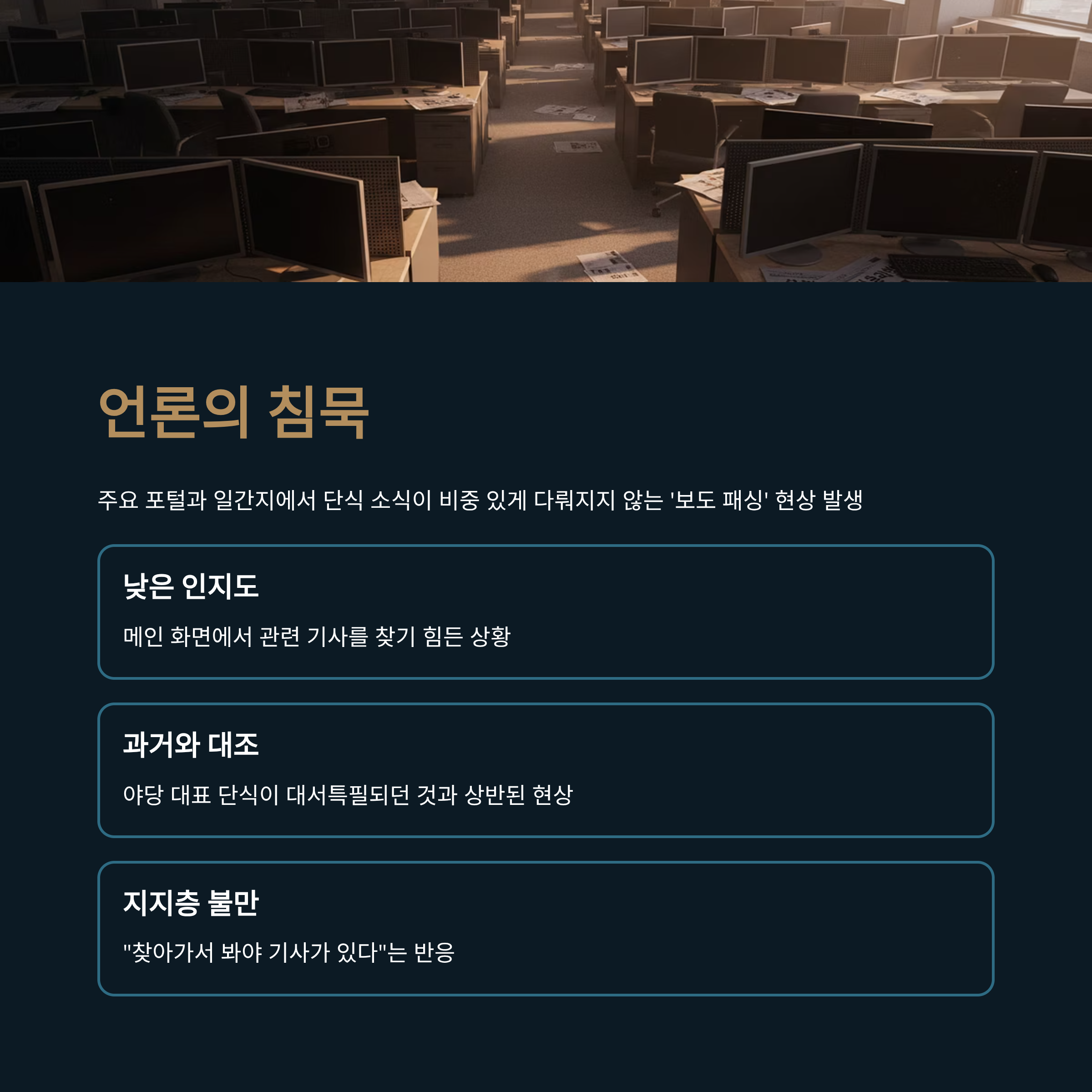 이번 단식 투쟁의 가장 큰 난관은 언론의 무관심과 보도 축소입니다. 분석에 따르면, 장 대표의 단식 선언 직후 주요 포털 사이트나 조선일보, 중앙일보 등 주요 일간지의 메인 화면에서 관련 기사를 찾아보기 힘든 상황입니다. 이는 과거 야당 대표들의 단식이 대서특필되던 것과는 대조적인 현상으로, 국민의힘 내부의 복잡한 사정과 언론 환경의 변화가 맞물린 결과로 보입니다. 지지자들 사이에서는 "찾아가서 봐야 기사가 있다"는 불만이 터져 나오고 있습니다.