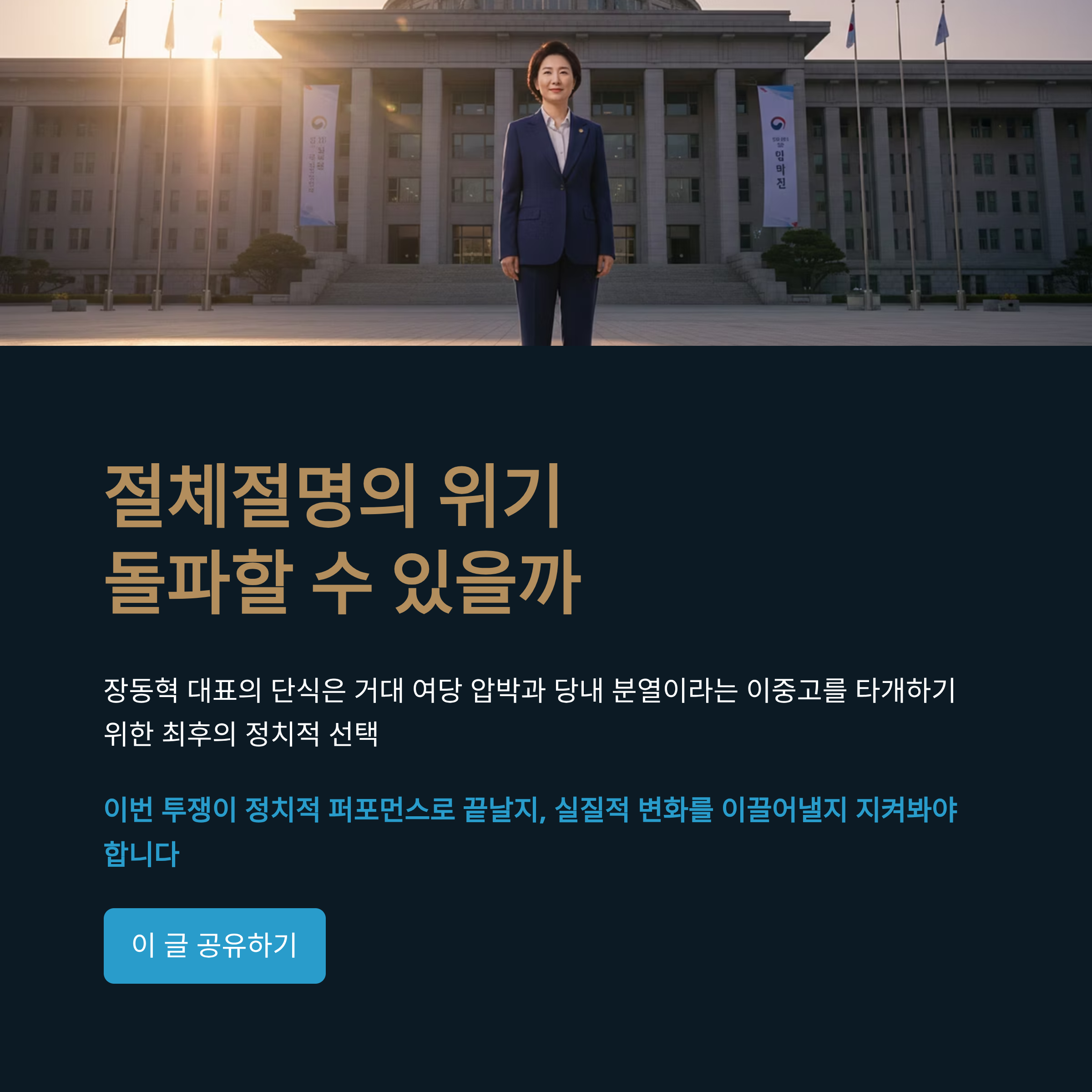 결과적으로 장 대표의 단식 투쟁은 거대 여당의 압박과 국민의힘 당내 갈등이라는 이중고를 타개하기 위한 최후의 정치적 선택으로 보입니다.