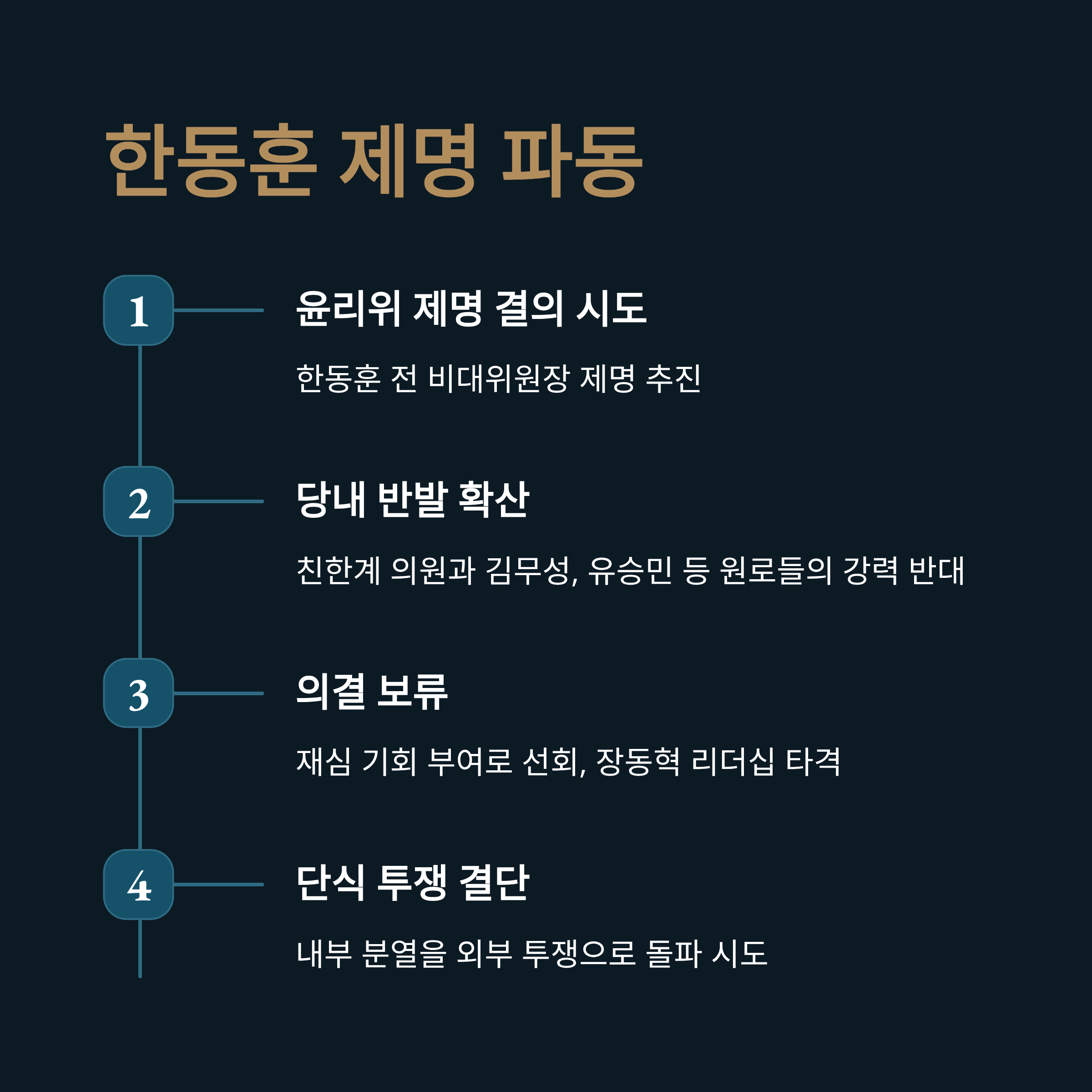 이번 단식은 한동훈 전 위원장 제명 문제를 둘러싼 당내 갈등 속에서 리더십 위기를 돌파하고 내부 결속을 다지려는 승부수로 풀이됩니다.