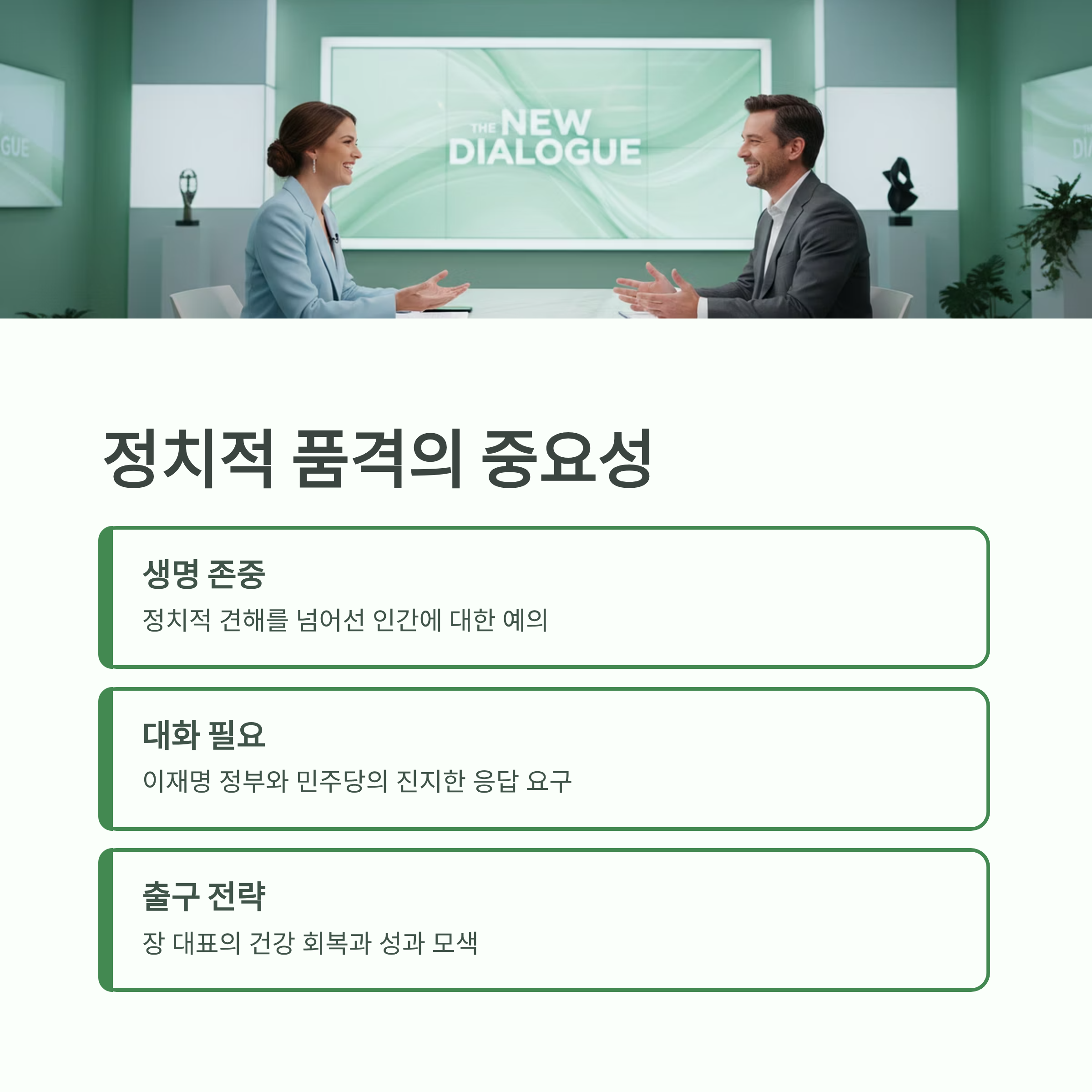 이제 공은 이재명 대통령과 거대 여당인 민주당에게 넘어갔습니다. 장 대표의 특검 요구를 무조건적으로 무시하거나 조롱으로 일관할 것이 아니라, 국정의 파트너로서 진지하게 대화에 임해야 할 책임이 있습니다. 동시에, 장동혁 대표 역시 건강이 심각하게 위협받고 있는 만큼, 투쟁의 성과를 바탕으로 국민과 당원의 뜻을 받들어 건강을 회복할 출구 전략을 모색해야 할 시점입니다. 극한의 대립 속에서도 최소한의 금도를 지키는 정치적 품격과 인간에 대한 예의가 그 어느 때보다 절실히 요구됩니다.