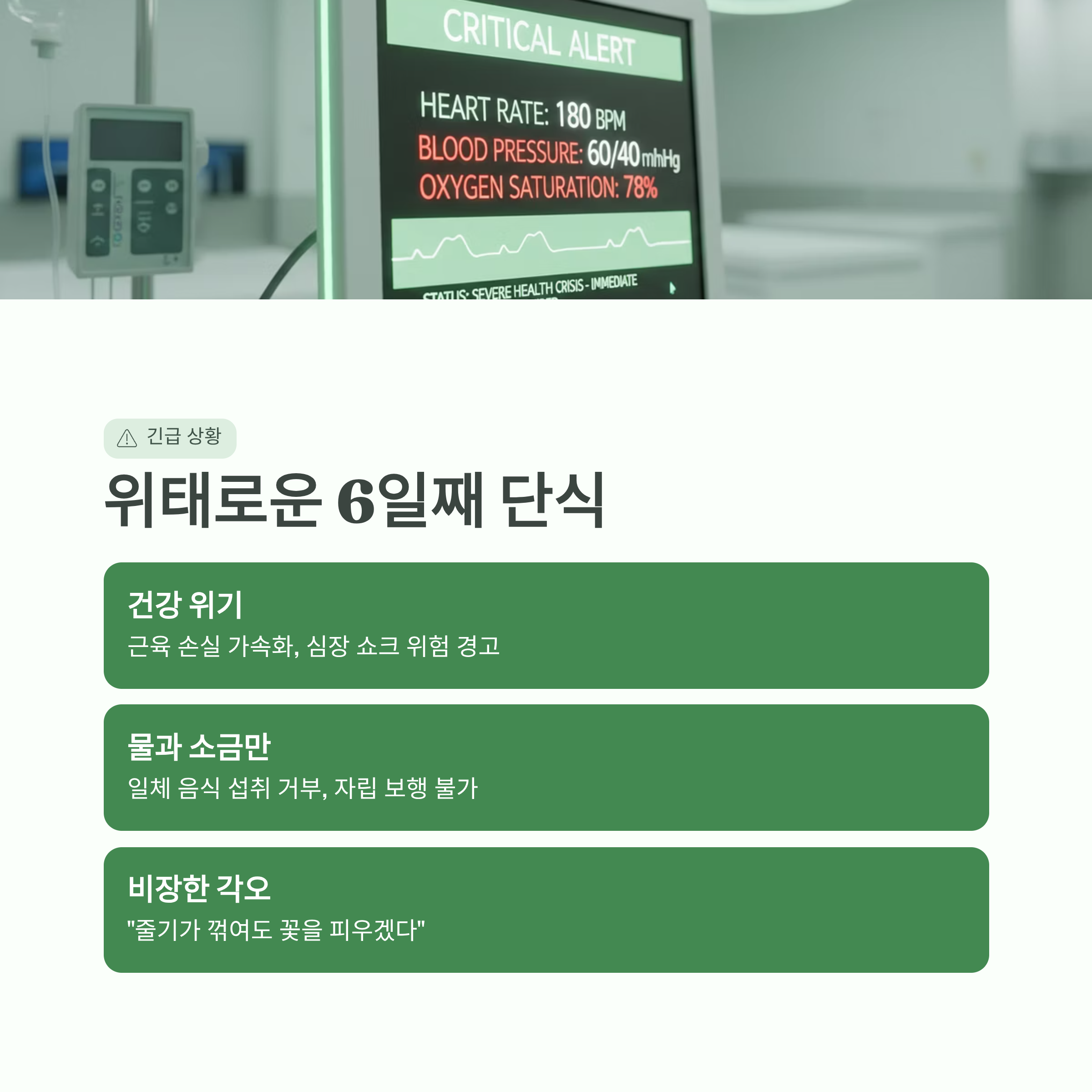 장동혁 국민의힘 대표의 단식이 6일째로 접어들면서 그의 신체적 한계상황이 뚜렷해지고 있습니다. 의료 전문가들은 장 대표가 물 이외의 섭취를 거부함에 따라 근육 소실이 가속화되고 있으며, 자립 보행이나 기립조차 어려운 상태라고 진단했습니다. 통상 단식 3일에서 5일이 지나면 체내 에너지원이 고갈되어 급격한 맥박 상승과 심장 쇼크가 발생할 우려가 커집니다. 장 대표는 페이스북을 통해 "줄기가 꺾여도 꽃을 피우겠다"는 비장한 메시지를 남기며, 자신의 투쟁 의지를 굽히지 않고 있습니다.