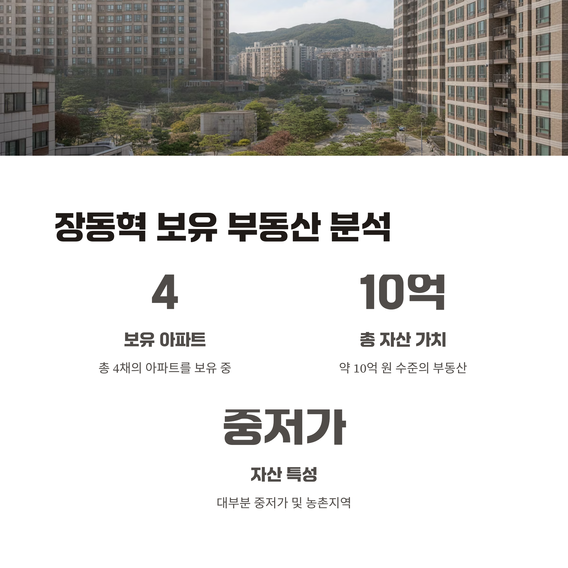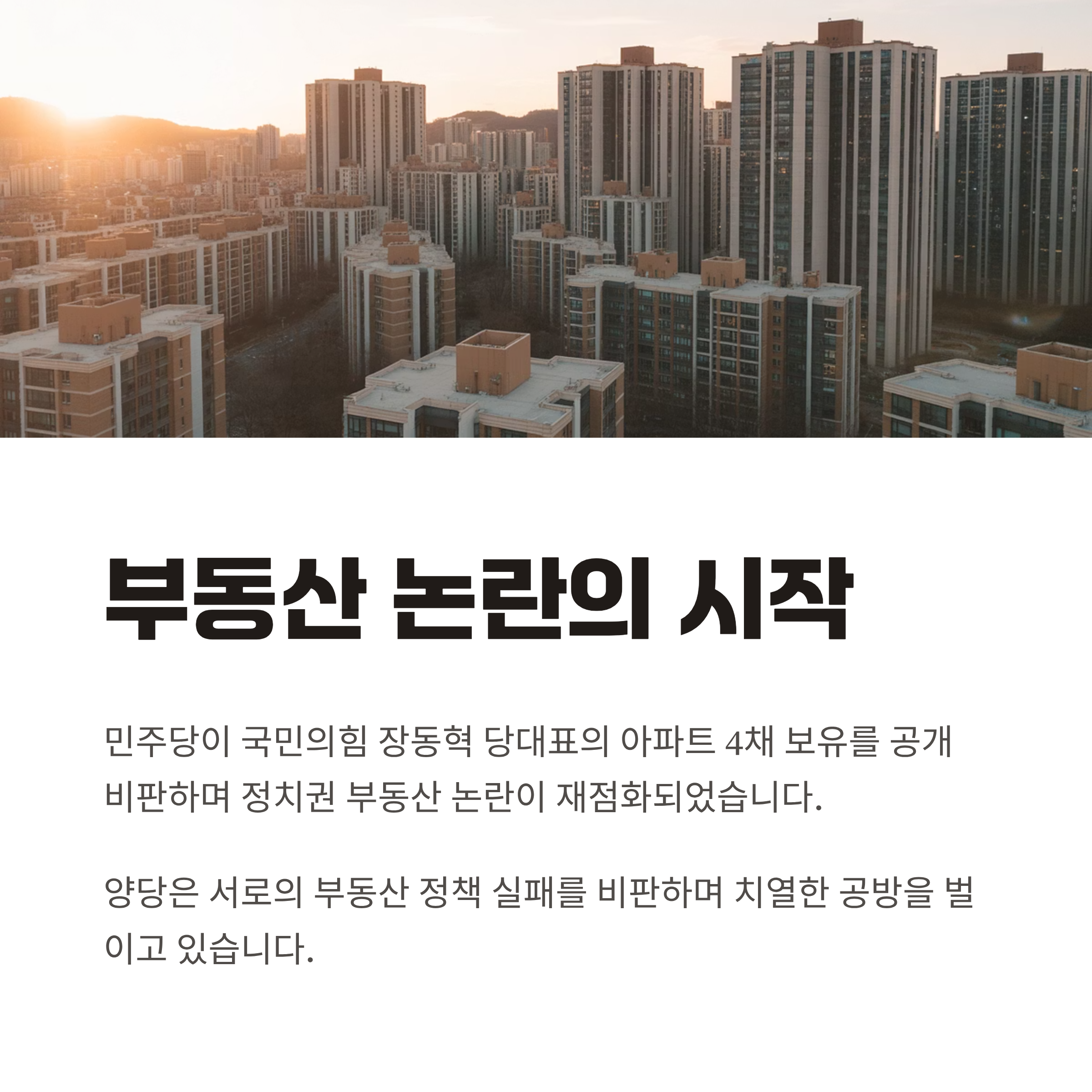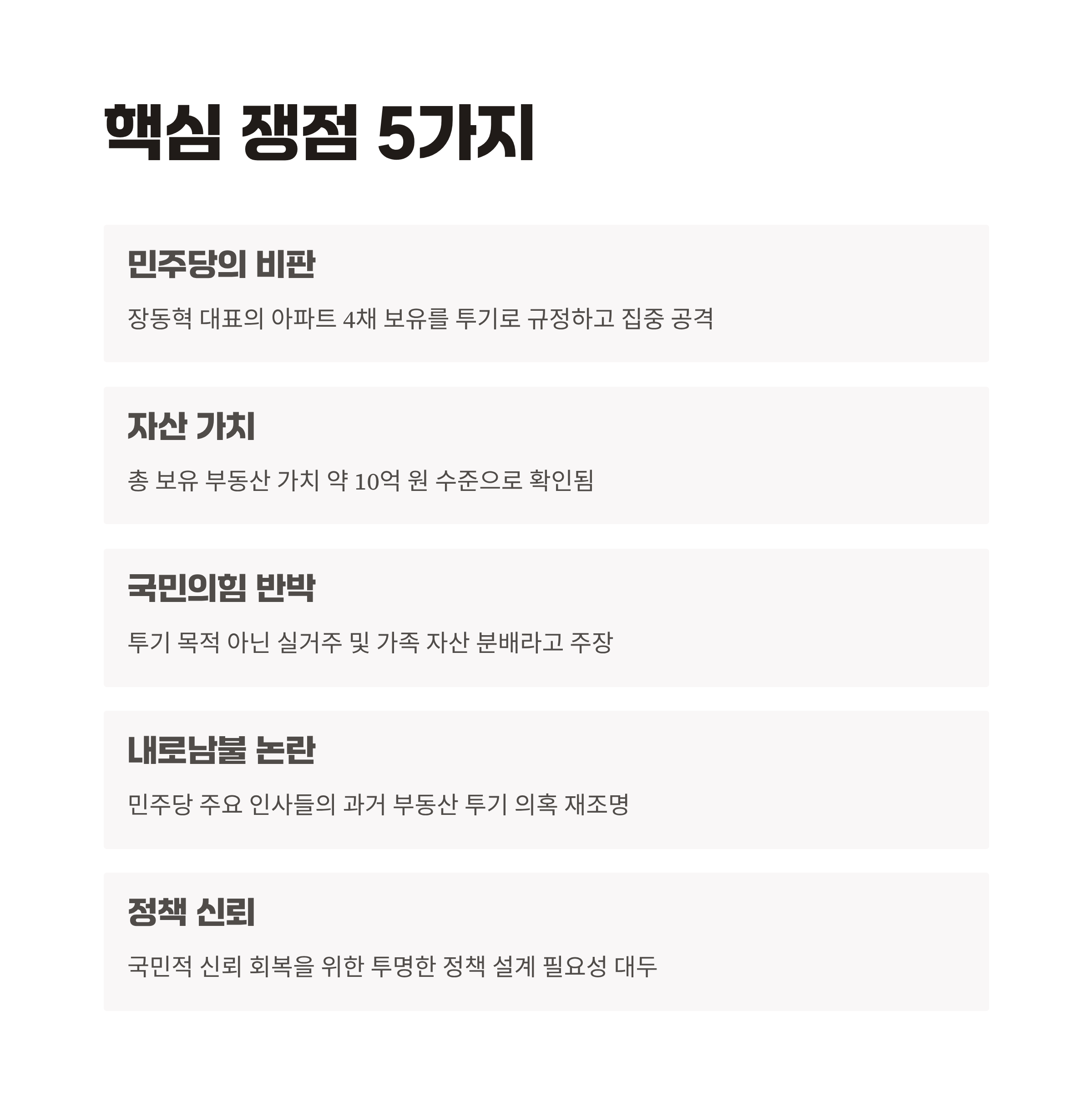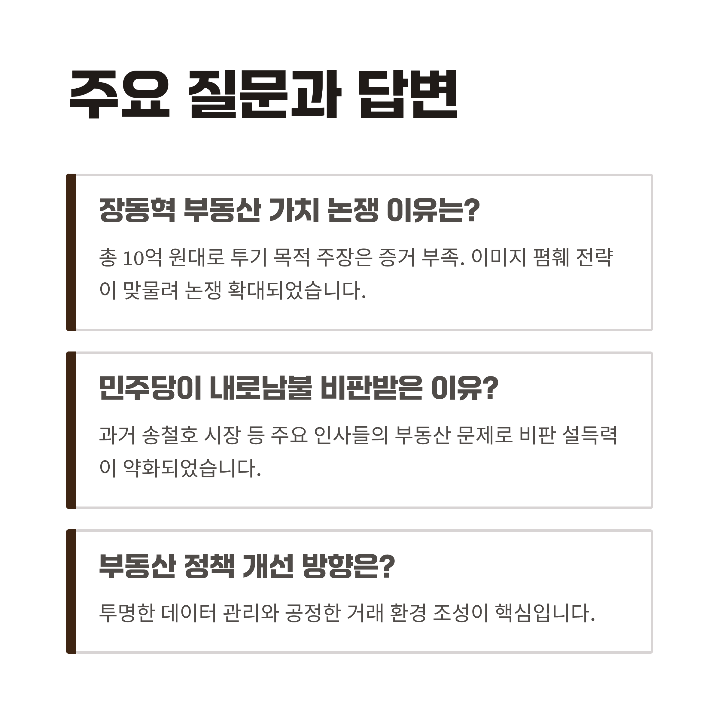 | A. 장 대표의 부동산은 총 보유가치가 약 10억 원대로, 민주당이 제기한 투기 목적 주장은 증거가 부족합니다. 대중적 이미지 폄훼 전략이 맞물리며 논쟁이 확대되었습니다. |