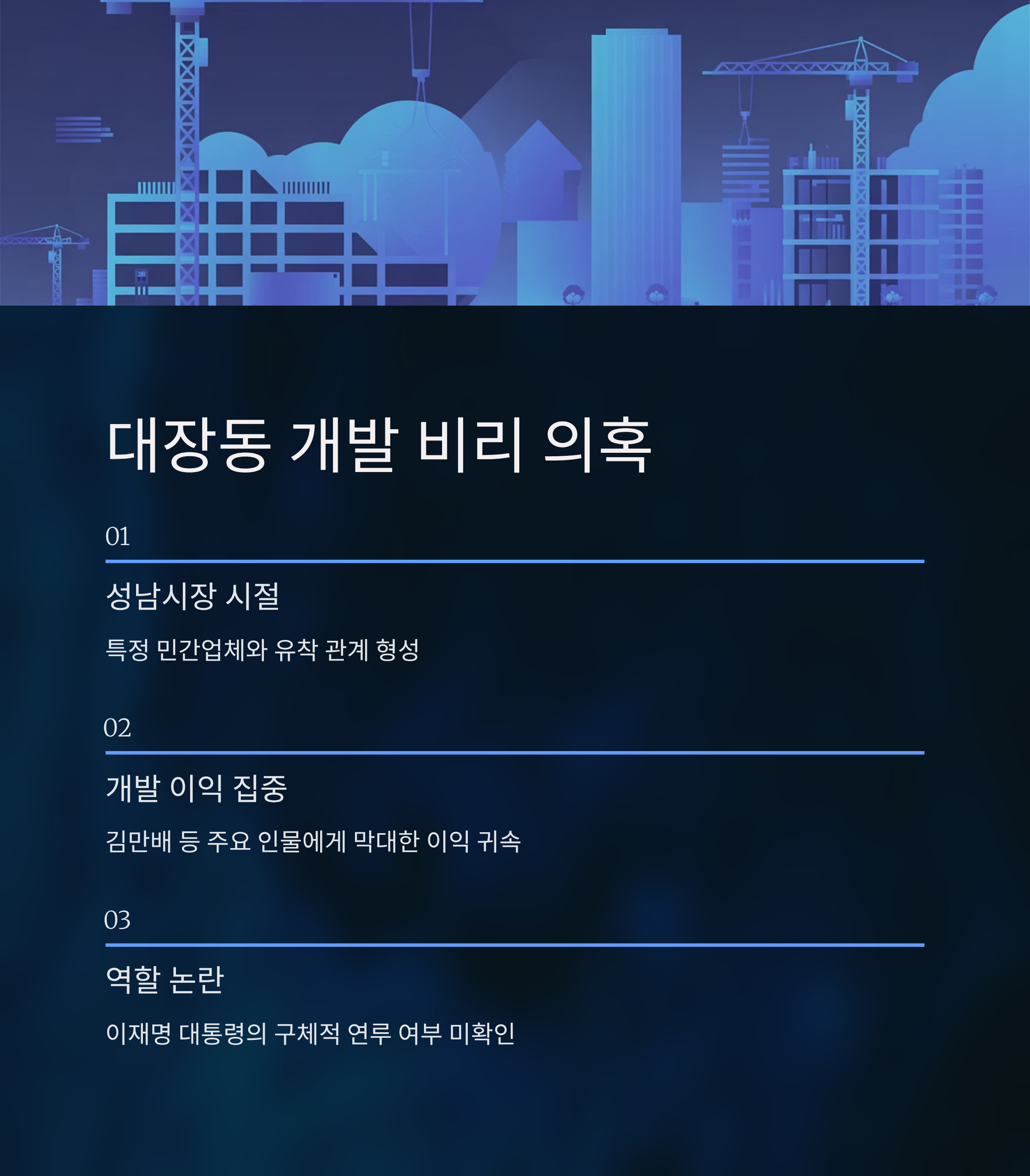 대장동 개발 비리 사건은 이재명 대통령의 정치적 경력을 흔들고 있는 주요 원인으로 꼽힙니다. 이 사건은 성남시장이었던 시절, 특정 민간업체와의 유착 관계로 인해 막대한 개발 이익이 특정인들에게 돌아갔다는 의혹에서 비롯되었습니다. 특히 김만배를 포함한 주요 인물들이 혐의를 받는 가운데, 이재명 대통령이 이 과정에서 어떠한 역할을 했는지에 대해 명확히 밝혀지지 않았다는 점이 주된 논란의 중심입니다.