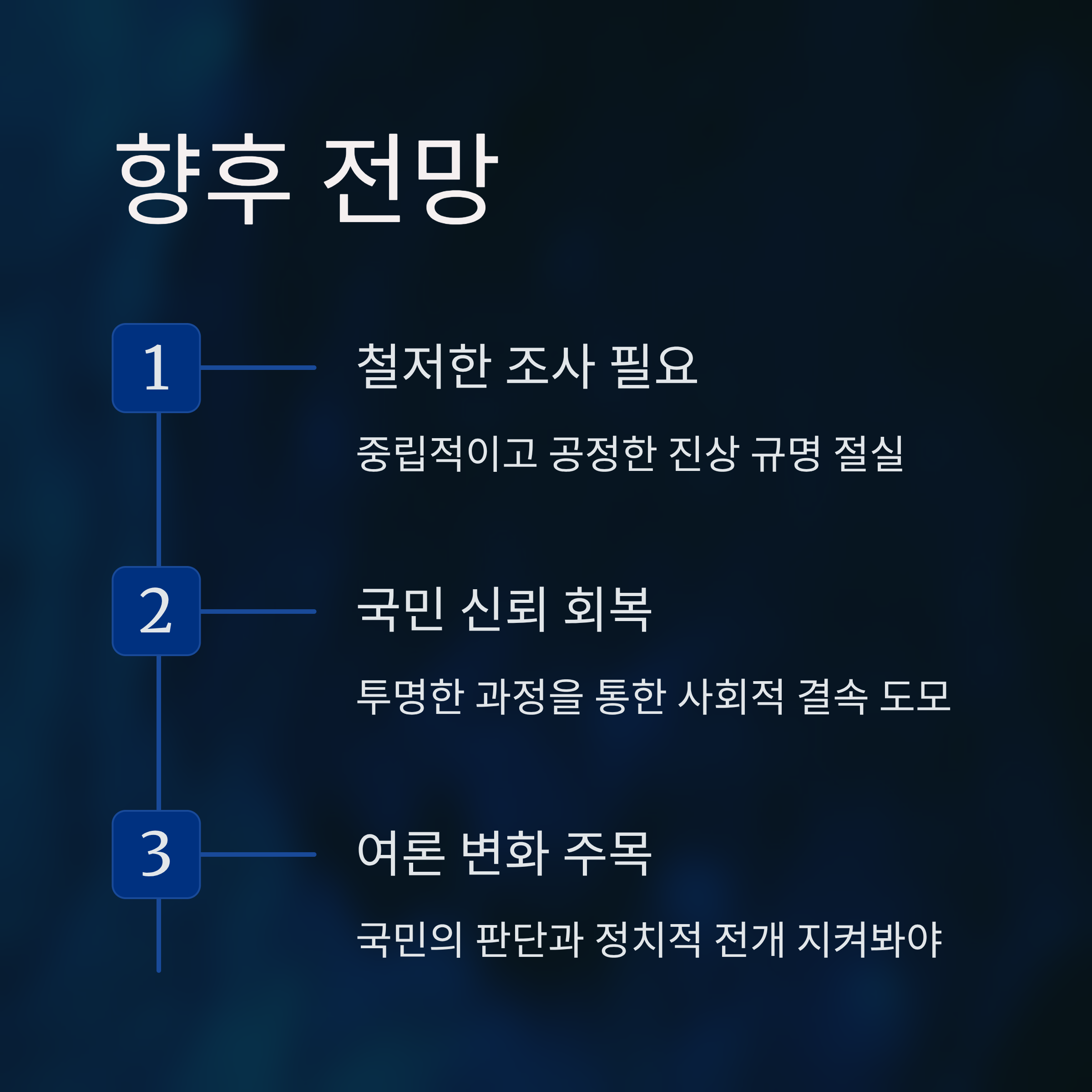 법적·정치적 갈등이 해소되기 위해서는 철저하고 중립적인 조사가 필요하며, 이를 통해 국가의 신뢰 회복과 국민들의 결속을 도모해야 할 것입니다. 향후 상황의 전개와 국민의 여론이 어떻게 변화할지는 모두가 지켜봐야 할 또 다른 과제입니다.