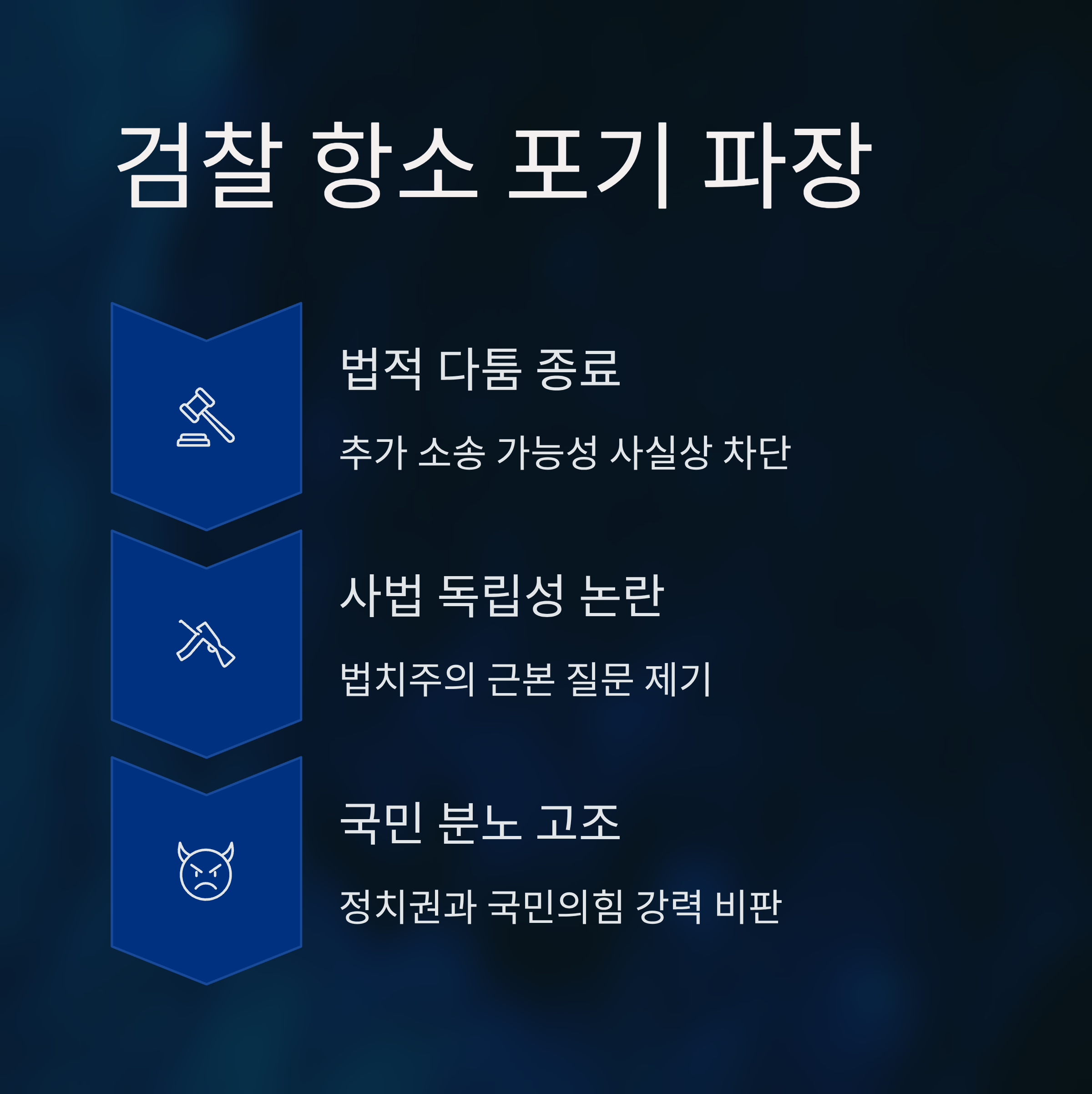 | A. 검찰이 항소를 포기하며 이 사건의 추가적 법적 해결 가능성이 차단되었습니다. 정치적 독립성과 국민적 신뢰가 손상되었다는 비판이 일고 있습니다. |
