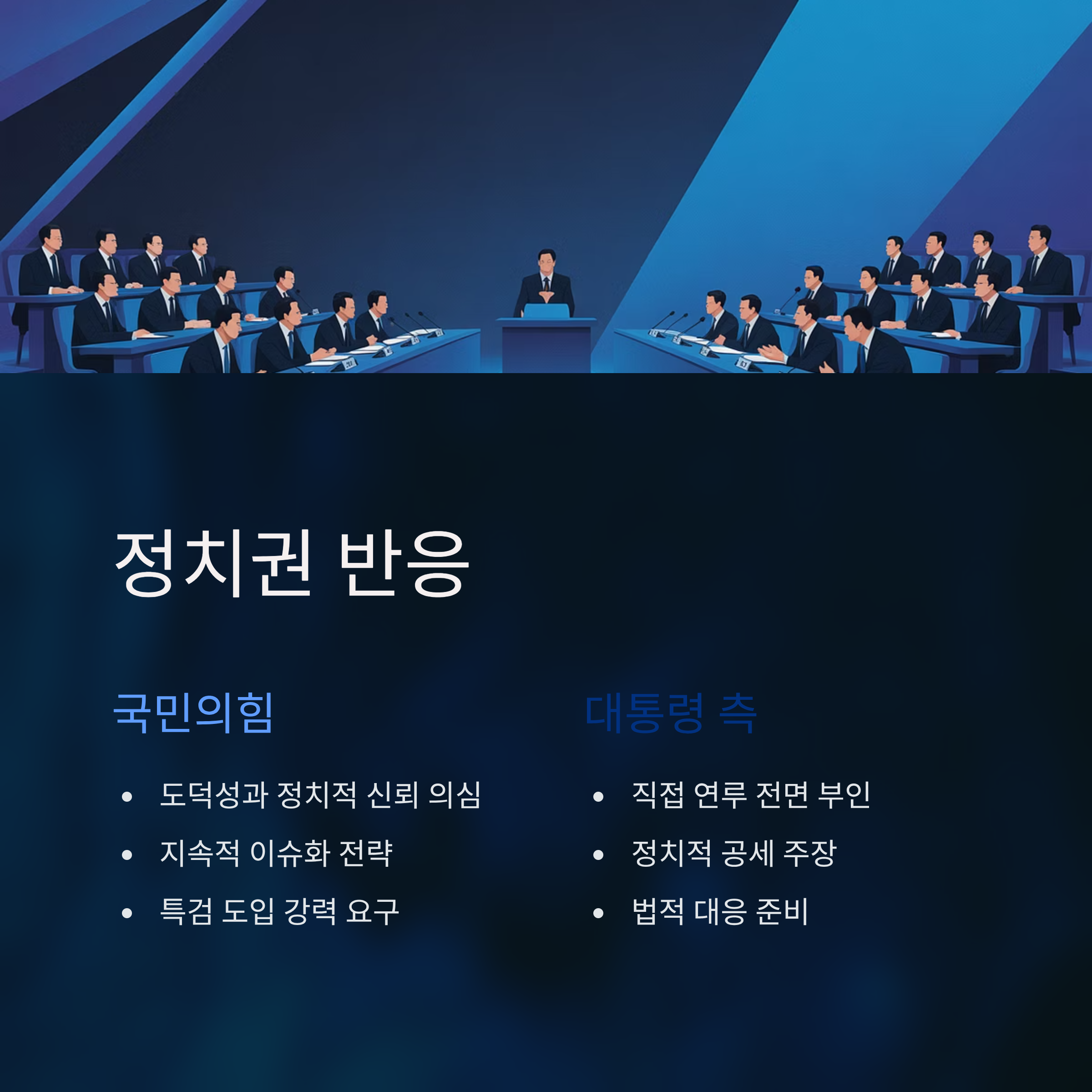 국민의힘은 이 사건을 통해 대통령의 도덕성과 정치적 신뢰를 의심하며 지속적으로 이슈화하고 있습니다. 반면, 대통령 측은 해당 사건과 본인의 직접적 연루를 전면 부인하며, 이는 정치적 공세에 불과하다고 주장하고 있습니다.