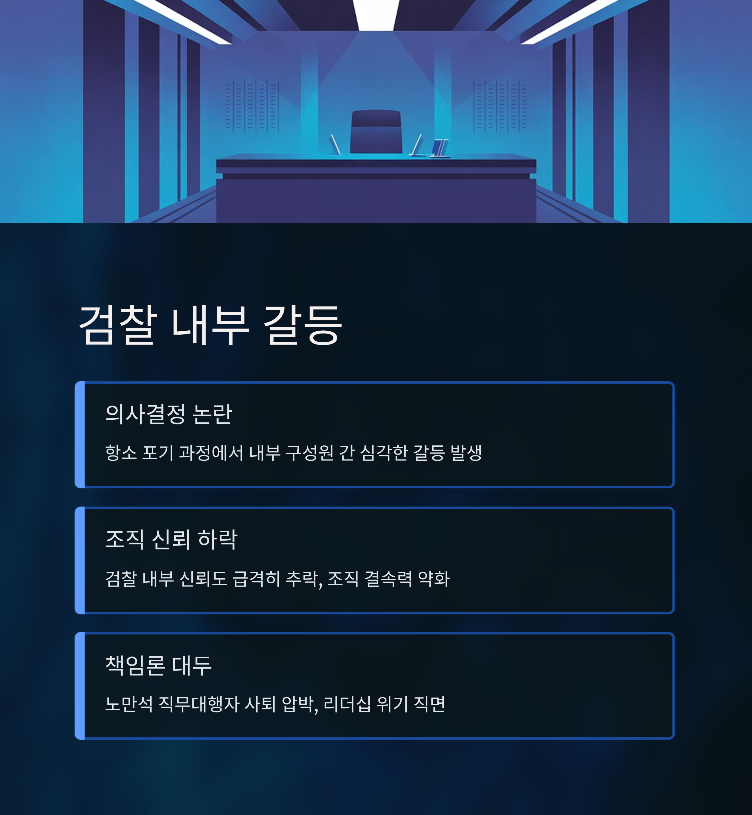 검찰 내부에서도 이러한 결정 과정을 두고 일부 구성원 간 갈등이 심화되고 있으며, 이는 조직 내 신뢰도 하락으로 이어지고 있습니다. 노만석 검찰 직무대행자는 책임론에 휩싸여 사퇴 압박을 받고 있는 상황입니다.