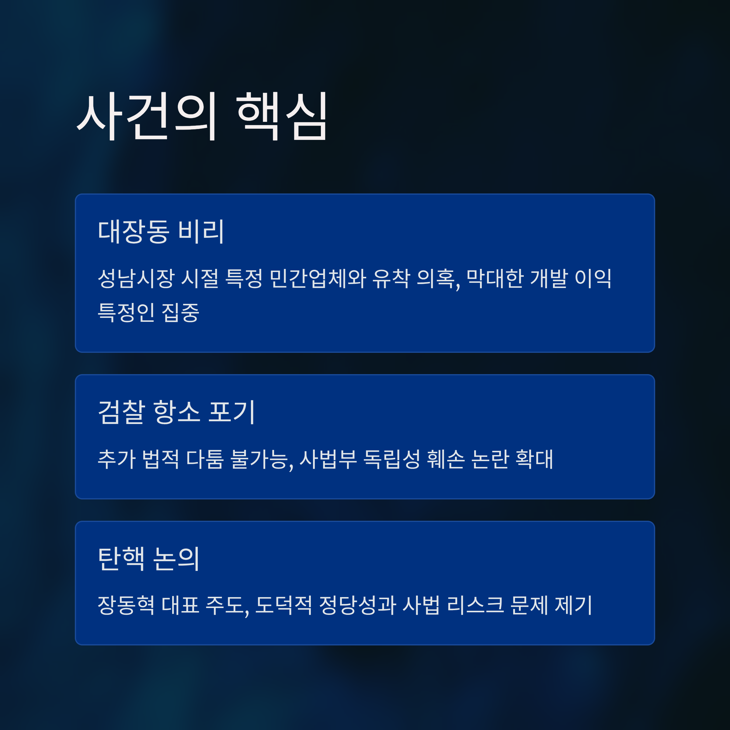 대장동 개발 비리로 촉발된 이번 사건은 검찰의 항소 포기 결정으로 '사법 체계 붕괴' 비판을 받고 있습니다.