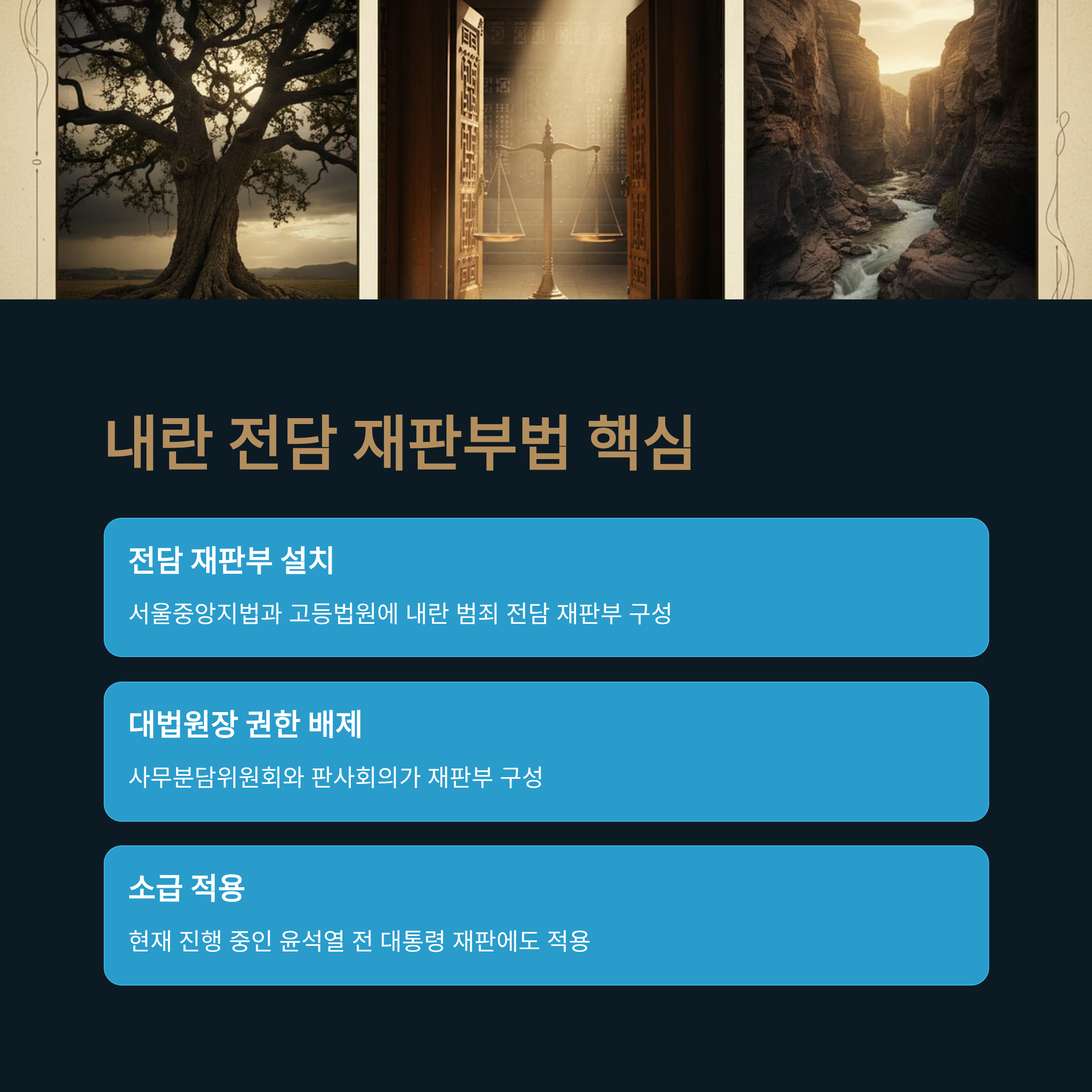 - 내란 전담 재판부 설치법 가결: 민주당 주도로 통과된 이 법안은 서울중앙지법과 고등법원에 내란 범죄 전담 재판부를 설치하고, 대법원장 권한을 배제한 채 재판부를 구성하도록 규정했습니다.