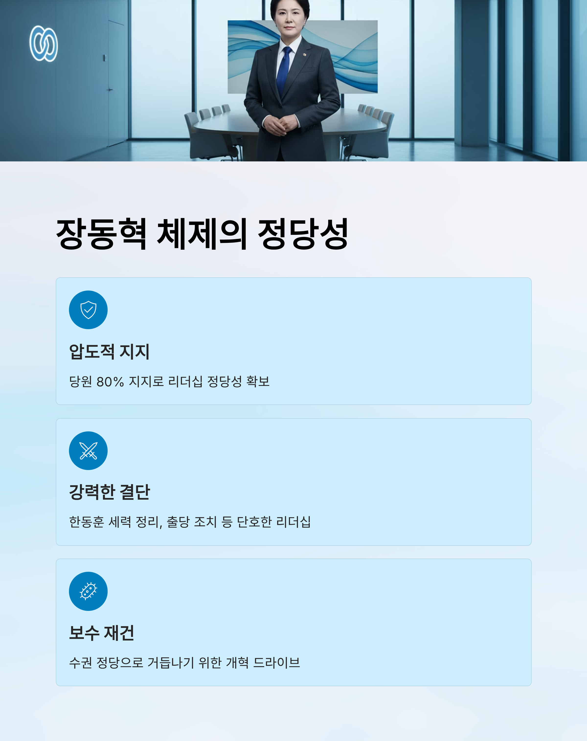 - 4. 결론: 장동혁 체제의 정당성 확보와 향후 과제 및 제언