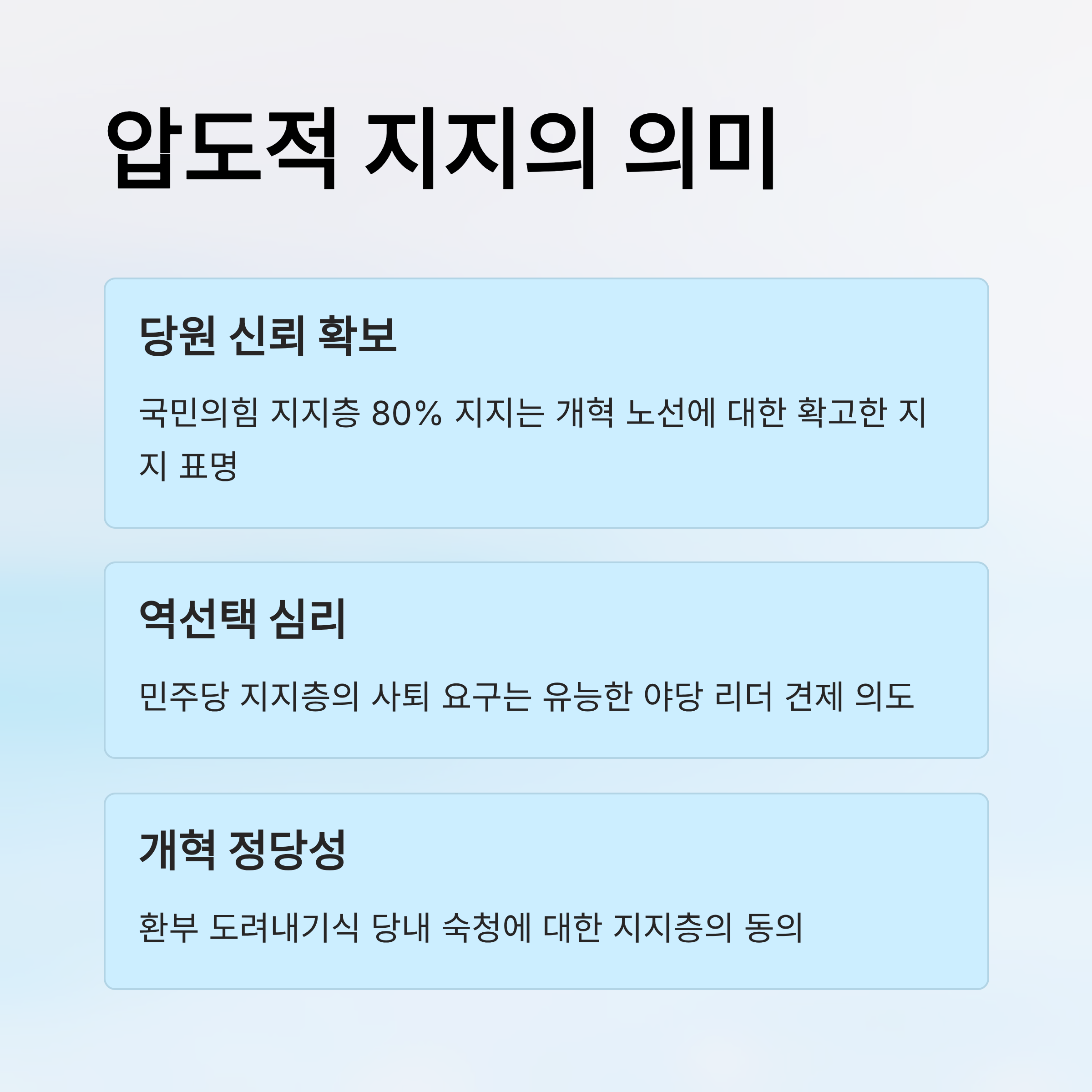 한동훈 및 김종혁 징계 문제에도 불구하고, 지지층은 장 대표의 '환부 도려내기'식 개혁을 지지하며 내부 숙청의 정당성을 부여하고 있습니다.