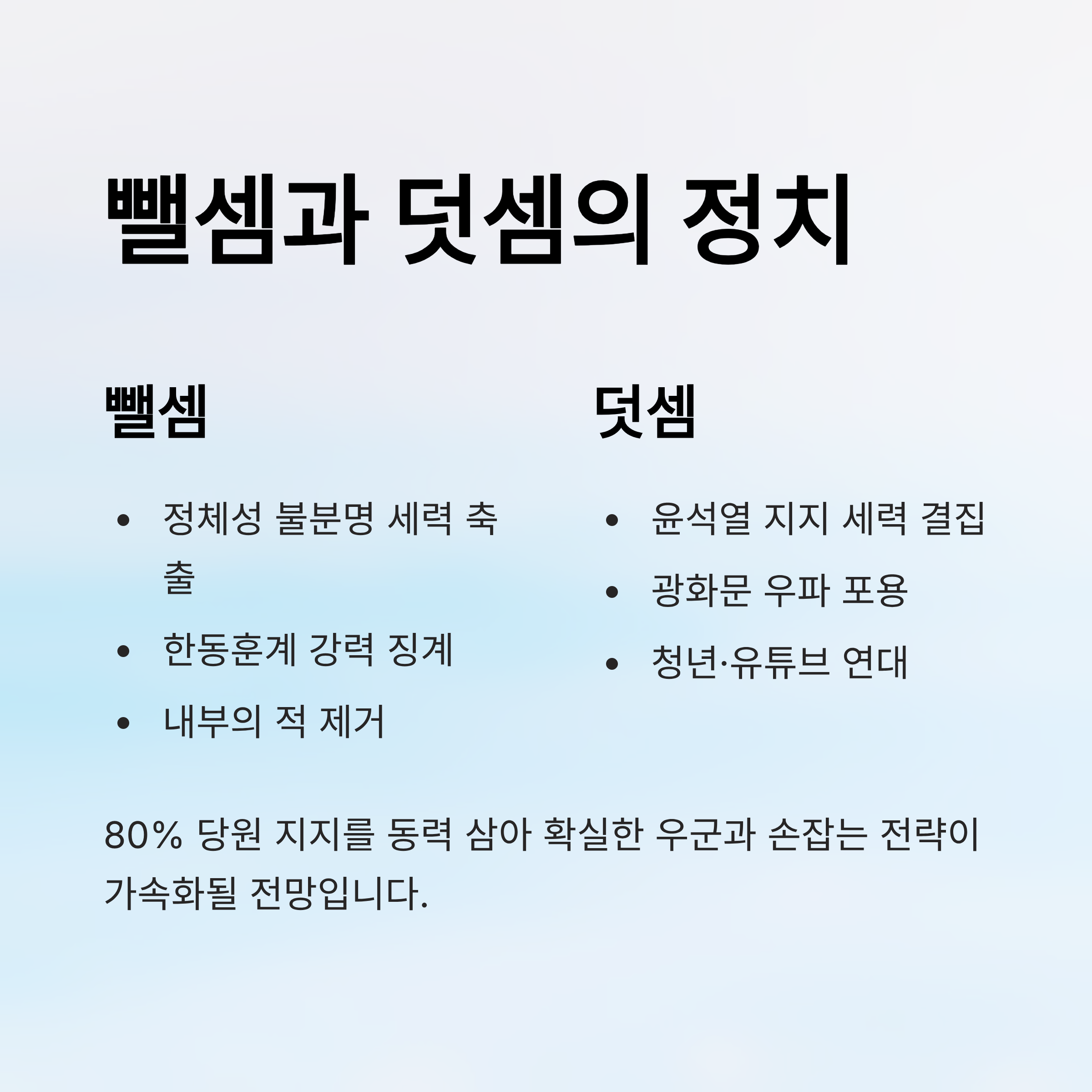 장동혁 대표는 제1야당 대표로서 이재명 정부에 맞서 싸우기 위해 원내뿐만 아니라 장외 투쟁 세력과의 연대가 필수적입니다. 유튜브 기반의 보수 스피커들과 청년 지지 그룹, 그리고 윤석열 전 대통령을 지지하는 세력을 하나로 묶어 '파이'를 키워야 합니다. 당내 소수라 하더라도 정체성이 불분명한 내부의 적을 축출하고, 확실한 우군과 손을 잡는 것이 장동혁 식의 '뺄셈과 덧셈의 정치'입니다. 이는 80%라는 당원들의 압도적 지지를 동력 삼아 더욱 가속화될 것으로 보입니다.