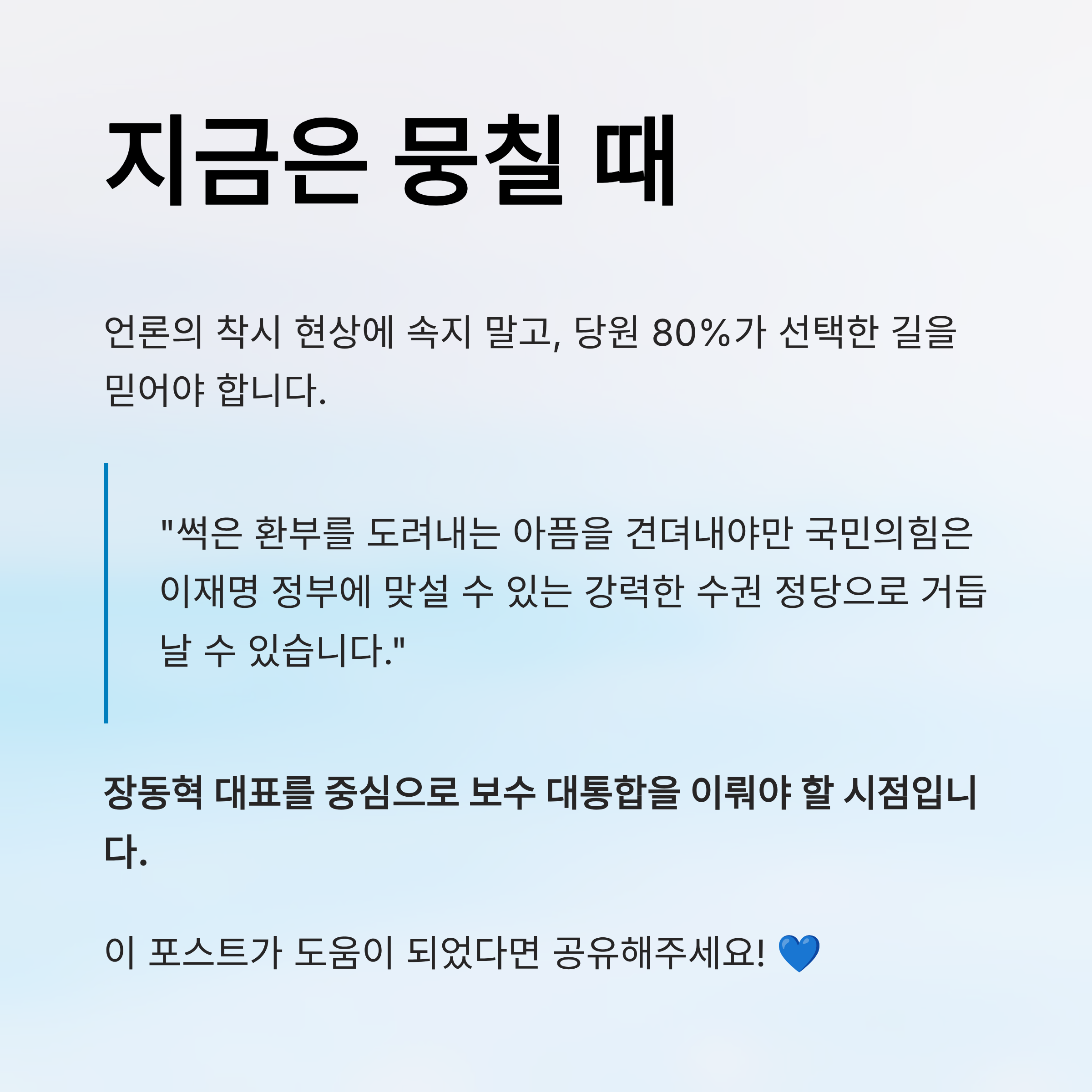 지금 장동혁 대표에게 필요한 것은 좌고우면하지 않는 결단력입니다. 윤석열 전 대통령을 배신하고 보수 분열을 초래했다는 비판을 받는 한동훈 세력을 과감히 정리하고, 김종혁 등에 대한 징계를 넘어선 출당 조치 등 강력한 리더십을 보여주어야 합니다. 또한, 김문수 전 장관 등 과거의 인물들이 내는 엇박자에 흔들리지 말고, 광화문 세력 및 청년 우파들과 연대하여 대정부 투쟁의 동력을 확보해야 합니다. 독자 여러분, 그리고 국민의힘 당원 여러분. 언론이 보여주는 전체 여론조사의 착시 현상에 속지 말아야 합니다. 보수 정당의 주인은 당원이며, 당원의 80%가 선택한 길은 틀리지 않았습니다. 썩은 환부를 도려내는 아픔이 있더라도, 이를 견뎌내야만 국민의힘은 이재명 정부에 맞설 수 있는 강력한 수권 정당으로 거듭날 수 있습니다. 장동혁 대표를 중심으로 뭉쳐야 할 때입니다.