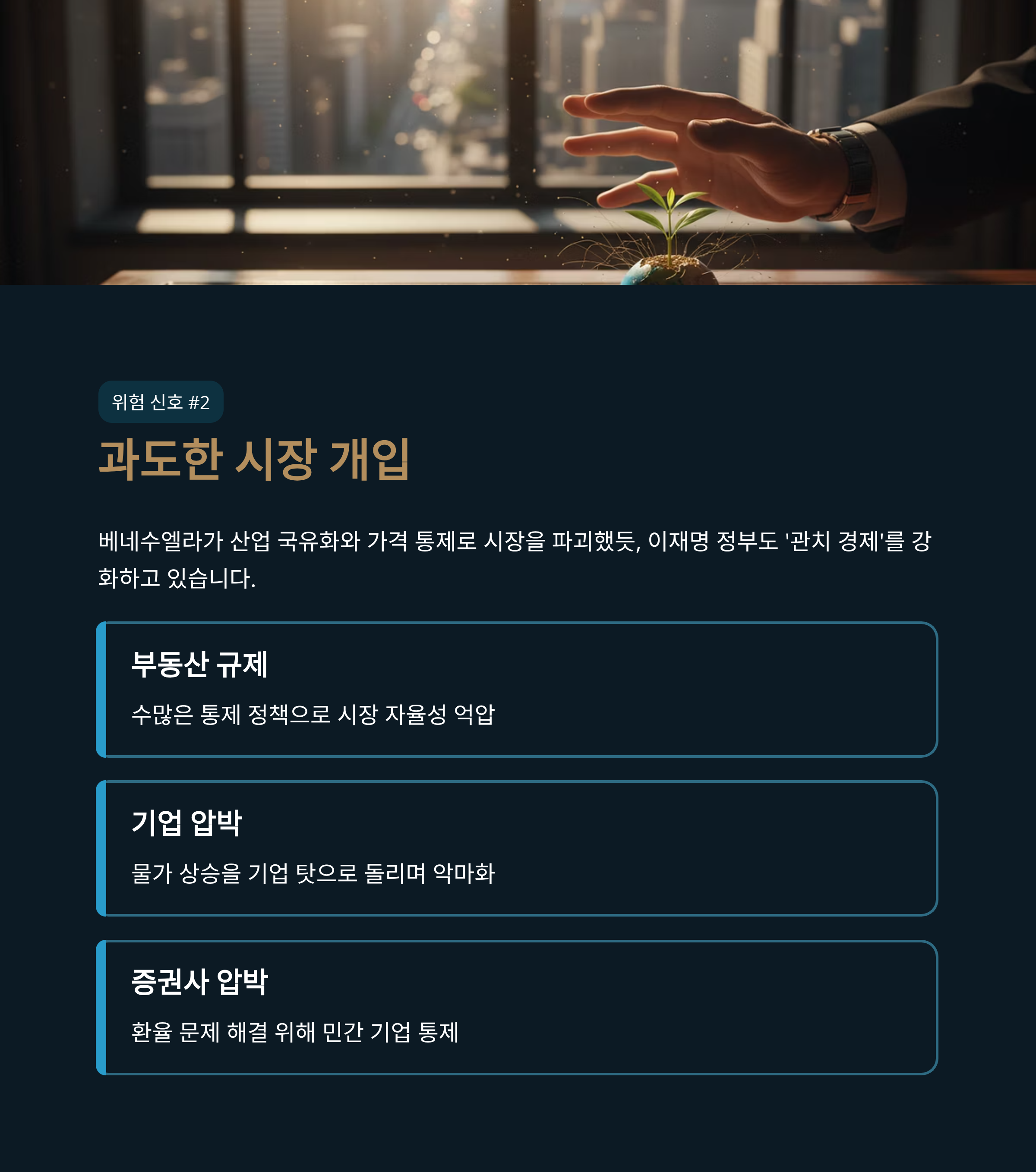 강력한 시장 개입과 통제 역시 두 정권의 두드러진 공통점입니다. 베네수엘라가 주요 산업 국유화, 생필품 가격 통제, 외환 통제 등 극단적인 방식으로 시장 자율성을 억압했다면, 이재명 정부 역시 부동산 시장을 통제하기 위해 수많은 규제 정책을 쏟아냈습니다. 또한 물가 상승의 원인을 기업의 독과점으로 돌리며 기업을 악마화하고, 환율 등 경제 문제가 뜻대로 풀리지 않자 증권사를 압박하는 등 '관치' 기조를 노골적으로 드러내고 있습니다. 이는 민간의 자율성과 창의성을 위축시켜 경제 전반의 활력을 떨어뜨리는 부작용을 낳을 수 있습니다.