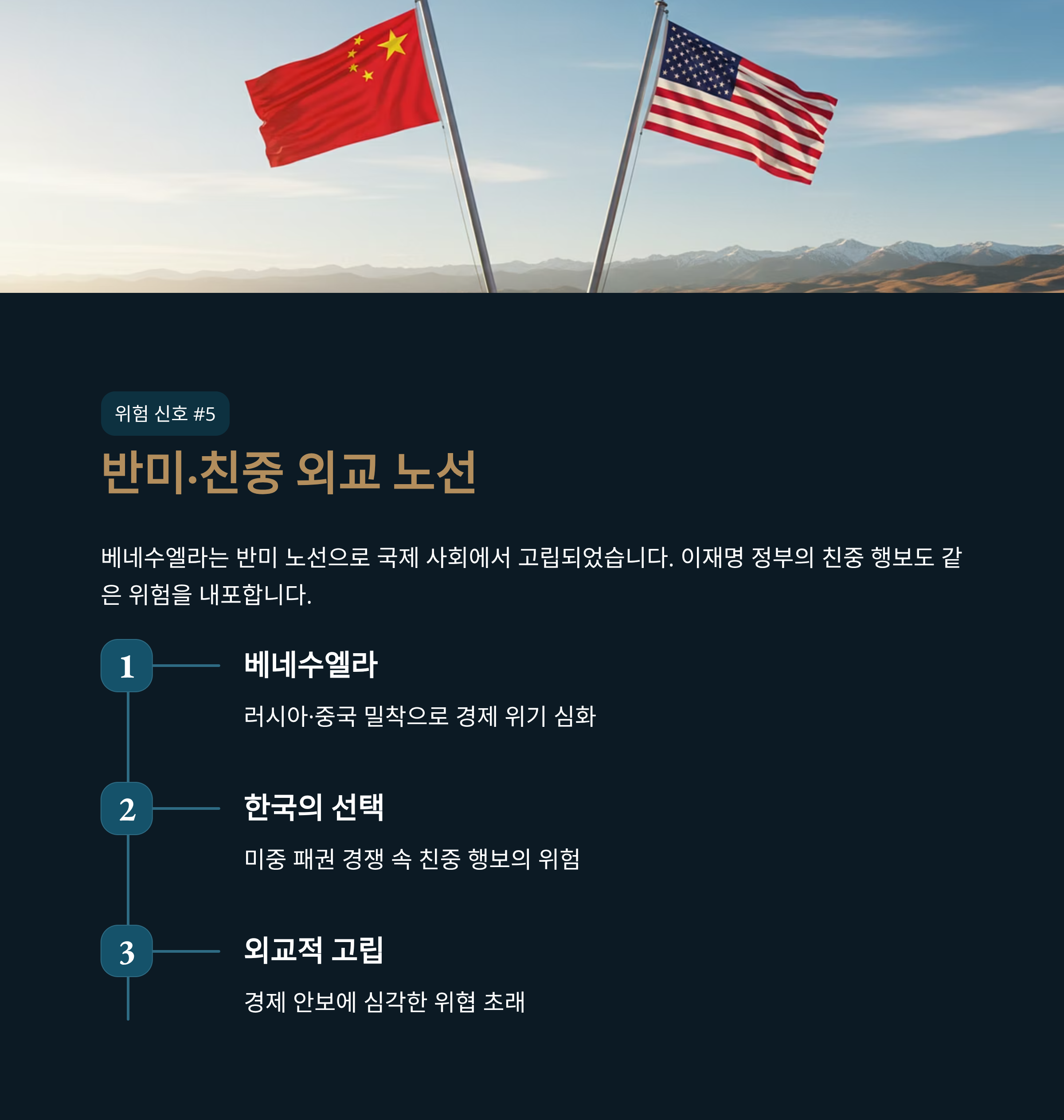 외교적으로 반미·친중 성향을 띠며 국제 질서의 흐름에 역행하는 모습도 평행이론을 뒷받침합니다. 베네수엘라는 노골적인 반미 노선을 걸으며 러시아, 중국 등과 밀착하다 국제 사회에서 고립을 자초했고, 이는 경제 위기를 더욱 심화시키는 요인이 되었습니다. 현재 미중 패권 경쟁이 심화되는 국제 정세 속에서 이재명 정부가 보이는 친중 행보와 미국과의 거리두기는 대한민국의 외교적 입지를 축소시키고 경제 안보에 심각한 위협을 초래할 수 있다는 경고가 나옵니다.
