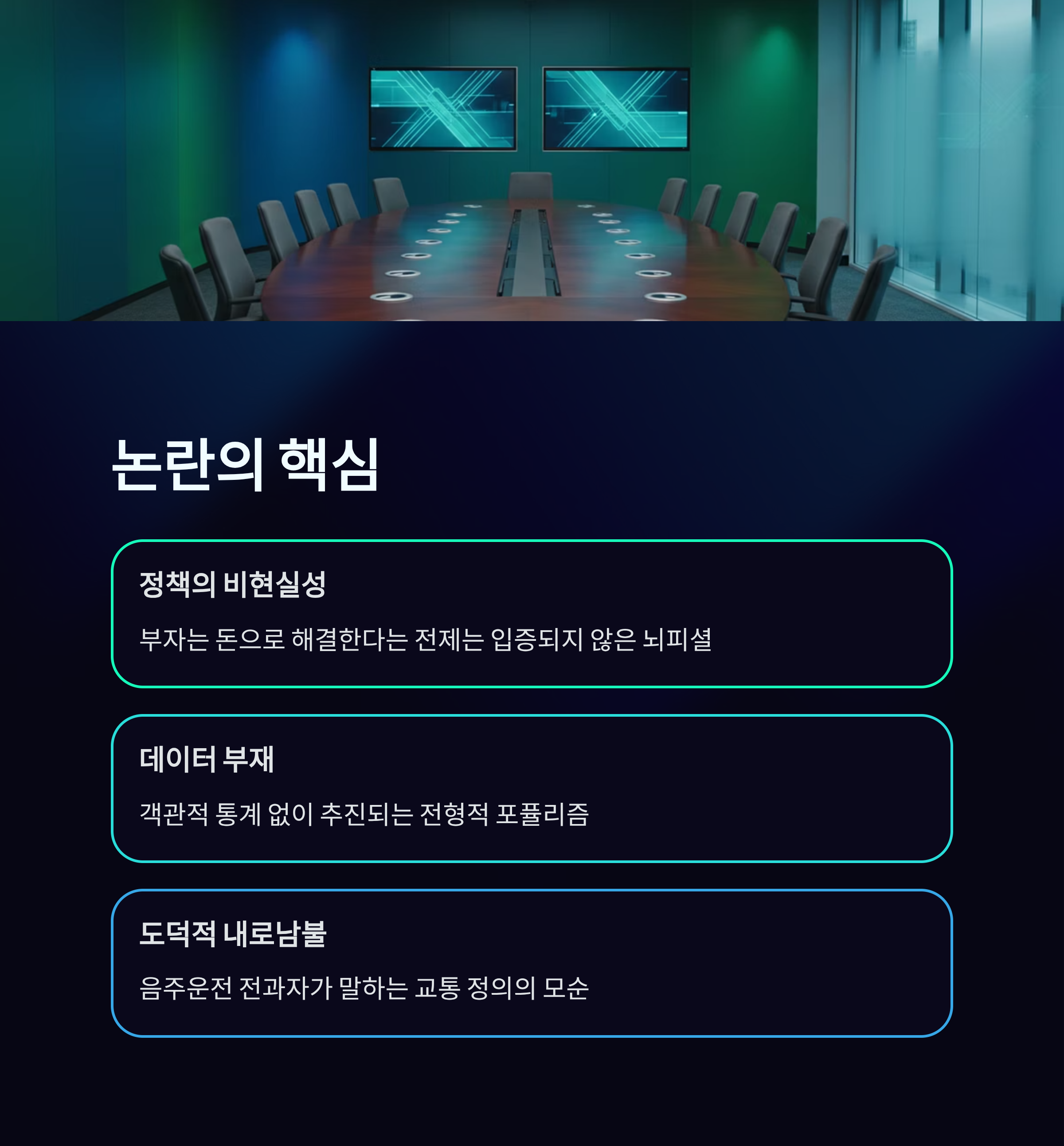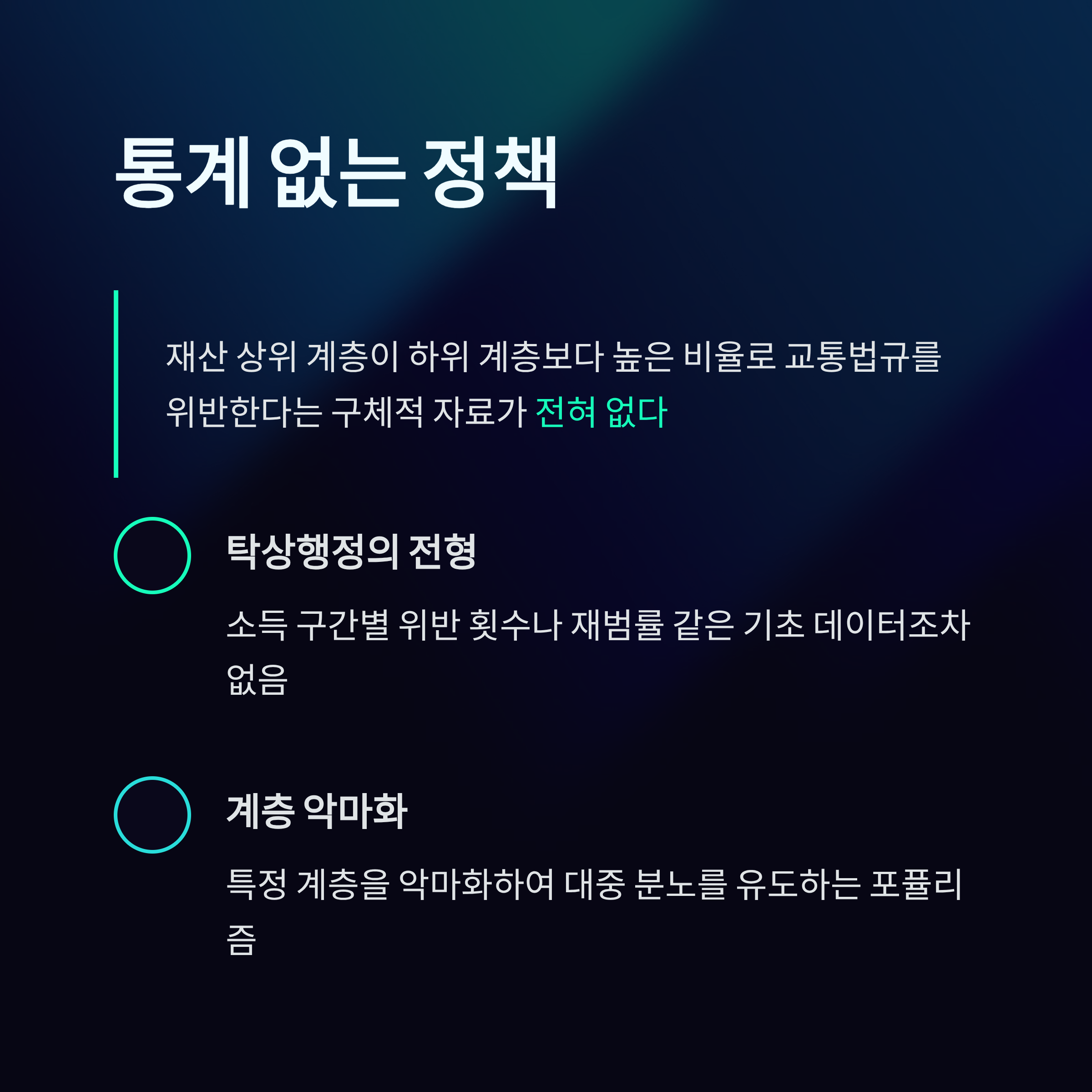 데이터의 부재: 부유층이 서민보다 교통법규 위반 빈도가 높다는 객관적 통계 없이 추진되는 정책으로, 전형적인 포퓰리즘적 발상입니다.
