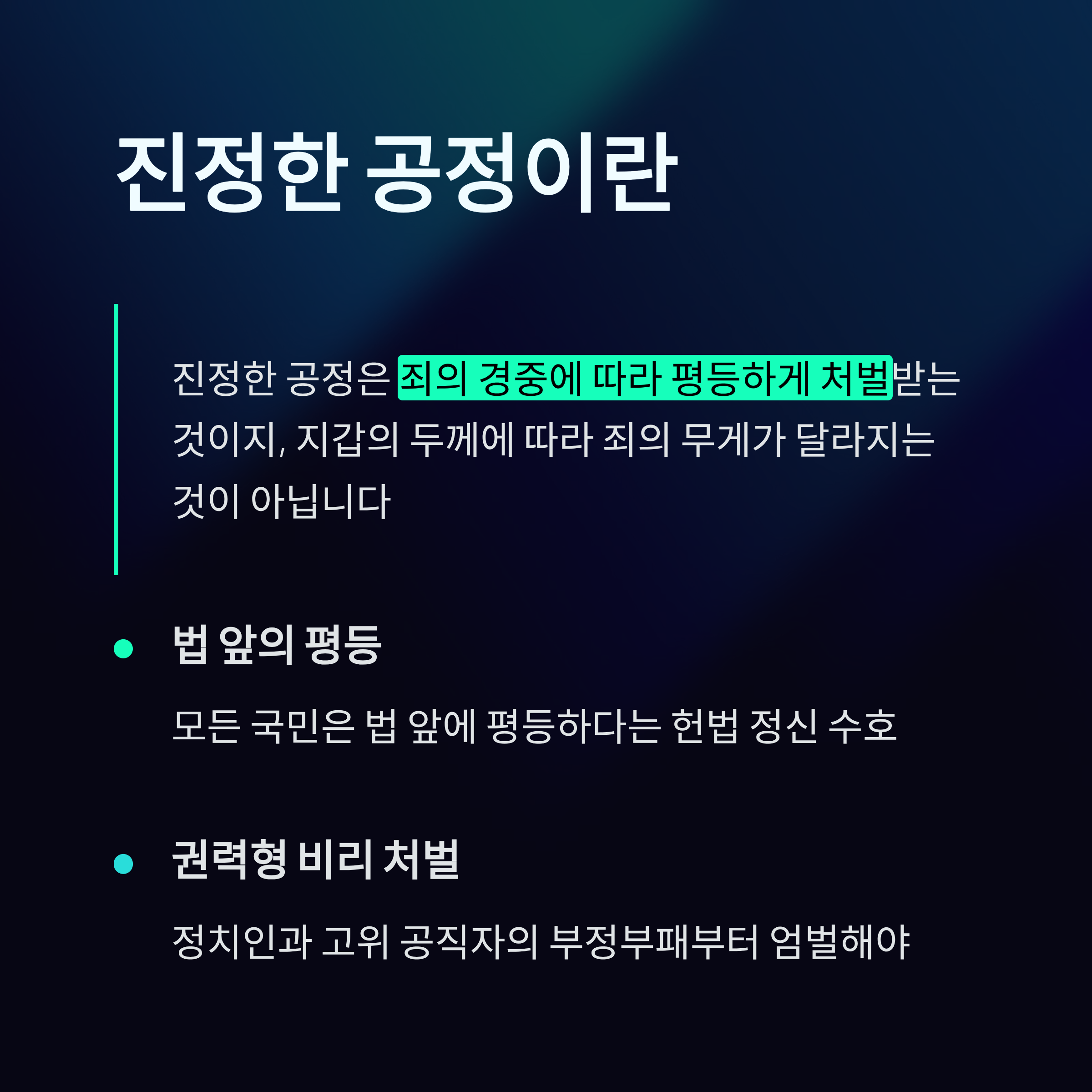 진정한 공정은 죄의 경중에 따라 평등하게 처벌받는 것이지, 지갑의 두께에 따라 죄의 무게가 달라지는 것이 아닙니다. 만약 '가진 자에게 더 가혹한 처벌'을 원한다면, 그 칼날은 국민이 아닌 권력을 쥔 정치인과 고위 공직자들의 부정부패를 향해야 마땅합니다. 뇌물수수, 배임, 성범죄 등을 저지른 정치인에게 받은 돈의 수십 배를 토해내게 하고 가중 처벌하는 법안부터 만드는 것이 국민이 바라는 진정한 정의일 것입니다. 국민 여러분은 얄팍한 '부자 증세' 프레임에 속아 진정한 법치주의가 훼손되는 것을 경계해야 합니다.