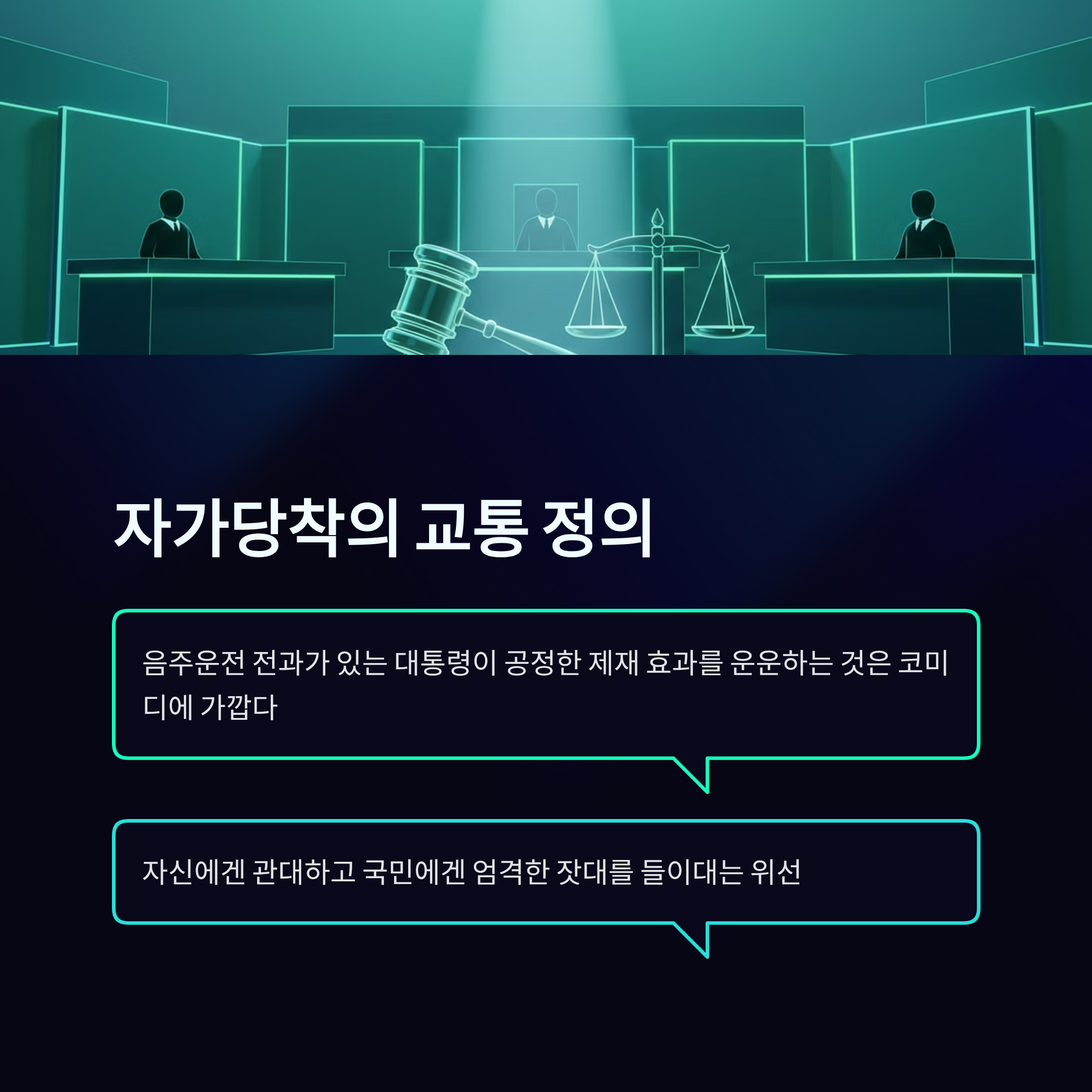 도덕적 내로남불: 이재명 대통령의 과거 음주운전 전과를 고려할 때, 그가 '교통 법규 준수'와 '공정'을 논하는 것은 위선적이라는 비판에 직면합니다.