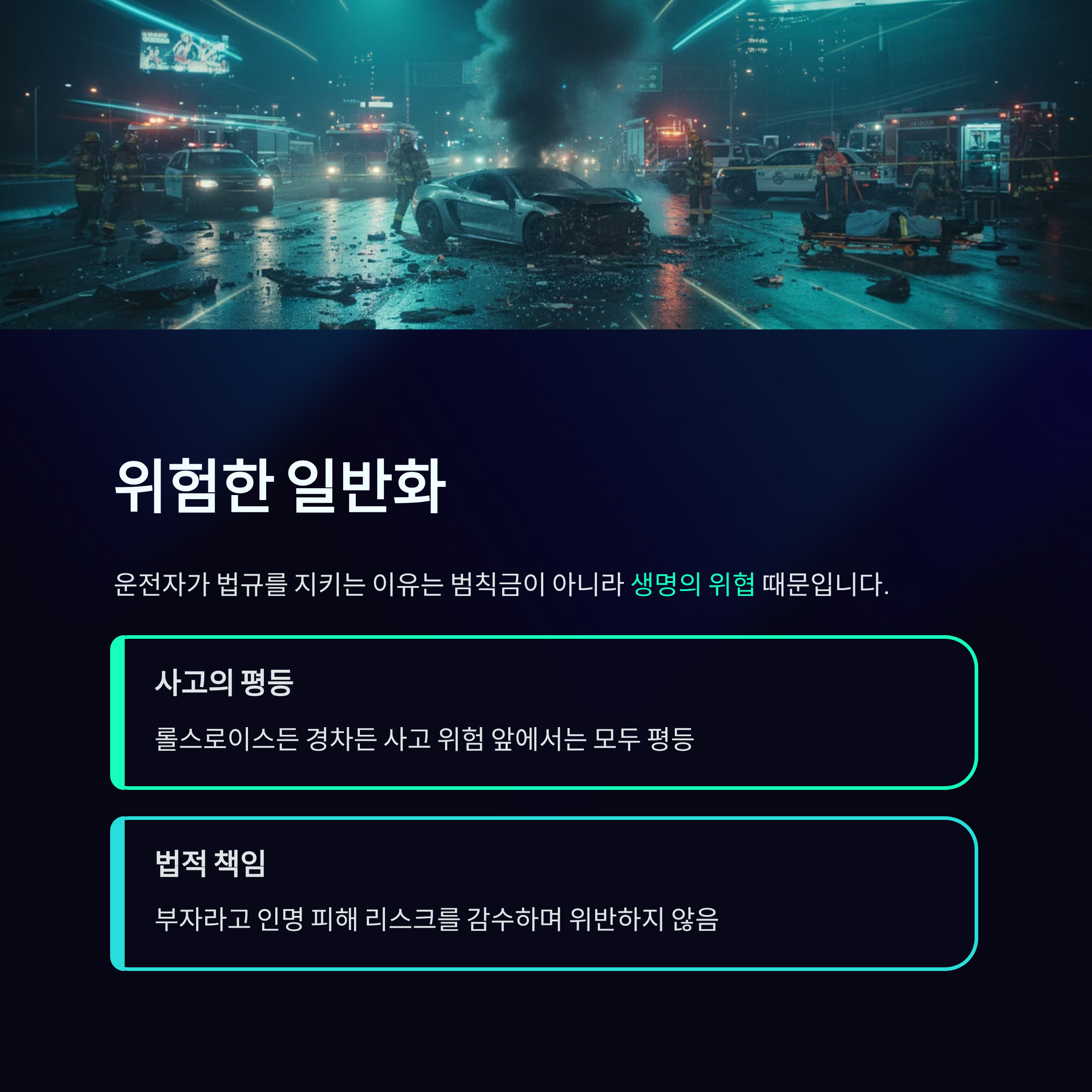 정부와 법무부가 내세우는 ‘재산 비례 벌금제’의 핵심 논리는 부유층에게 현행 범칙금 5만 원, 10만 원은 껌값에 불과하여 제재 효과가 없다는 것입니다. 그러나 이는 인간의 심리와 교통사고의 본질을 완전히 오판한 것입니다. 운전자가 교통법규를 지키는 근본적인 이유는 범칙금이 아까워서가 아니라, 사고 발생 시 본인과 타인의 생명이 위협받기 때문입니다. 롤스로이스를 타든 경차를 타든 사고의 위험 앞에서는 모두가 평등하며, 부자라고 해서 사고 처리에 따르는 법적 책임과 사회적 비용, 인명 피해의 리스크를 감수하면서까지 고의로 위반을 즐기는 사람은 극히 드뭅니다.