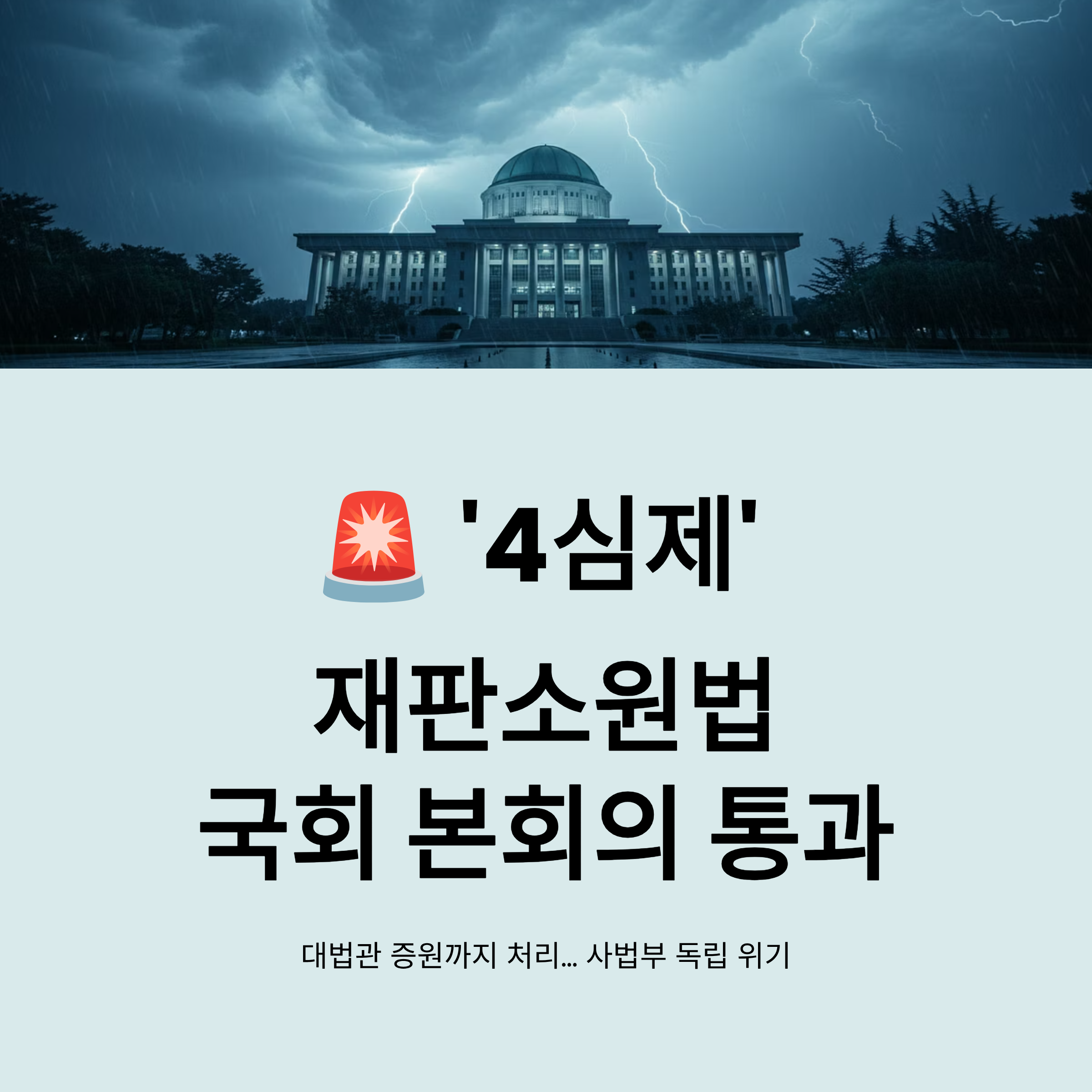 이번 국회 본회의에서 재석 225명 중 찬성 162명으로 가결된 재판소원법은 대법원 확정판결에 불복해 헌법재판소에 다시 심판을 구할 수 있는 길을 열어주었습니다. 이는 사실상 4심제를 도입하는 것으로, 대법원은 "재판 당사자들이 소송 지옥에 빠질 수 있다"며 강력히 반대해 왔고 법원행정처장은 사의를 표명했습니다.