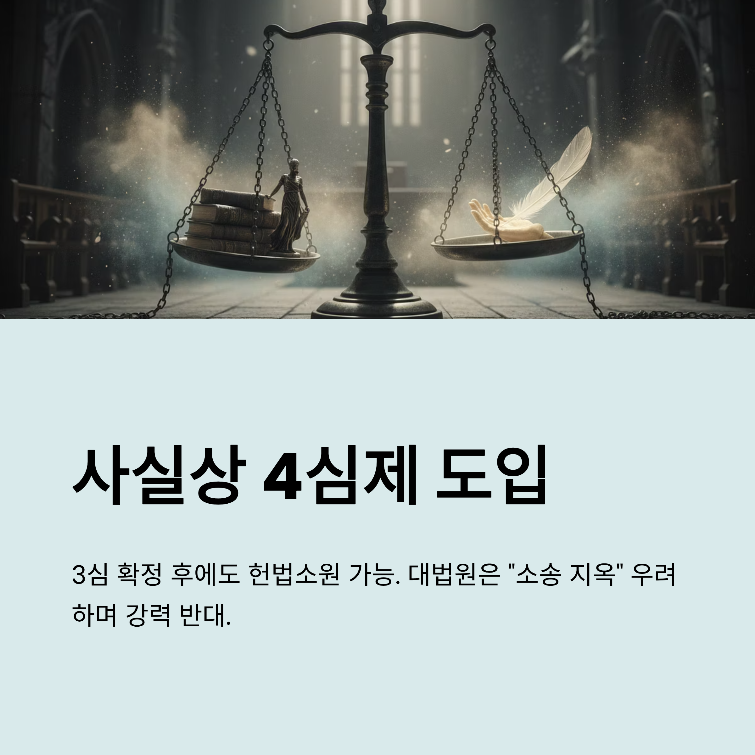 사법부 무력화 우려: 대법원의 최종심 기능을 헌법재판소가 견제하게 되면서, 사법부의 최종 판결 권한이 약화될 수 있습니다.